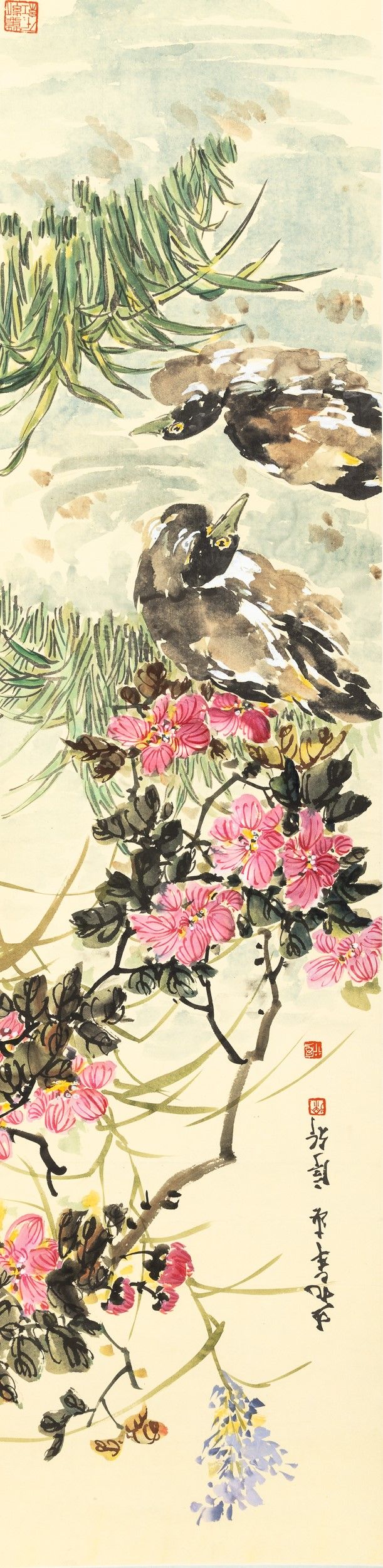 Dipinto su carta raffigurante papere nello stagno, rami in fiore e iscrizione, Cina, [..]