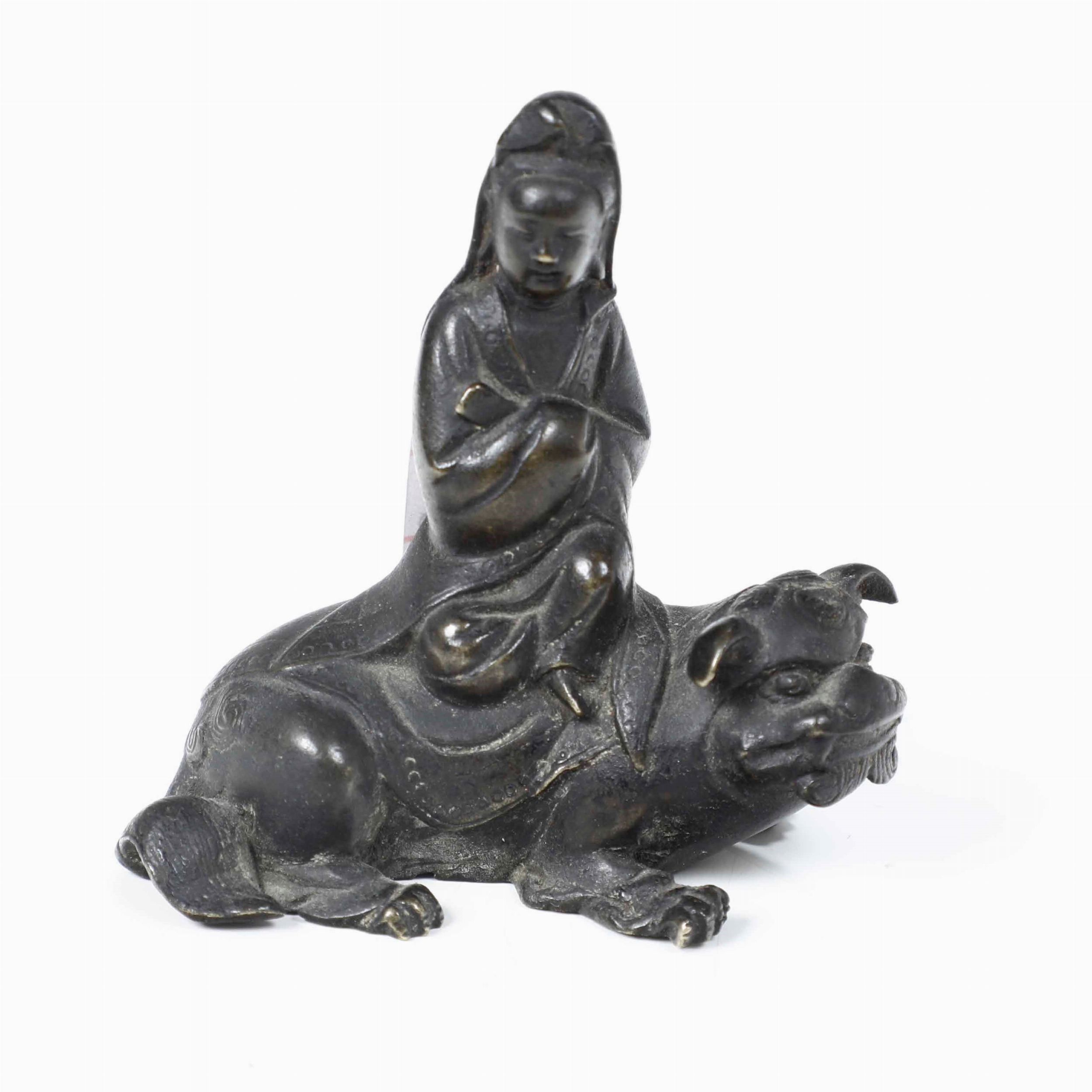 Figura di Guanyin seduta su cane di Pho in bronzo, Cina, XX secolo