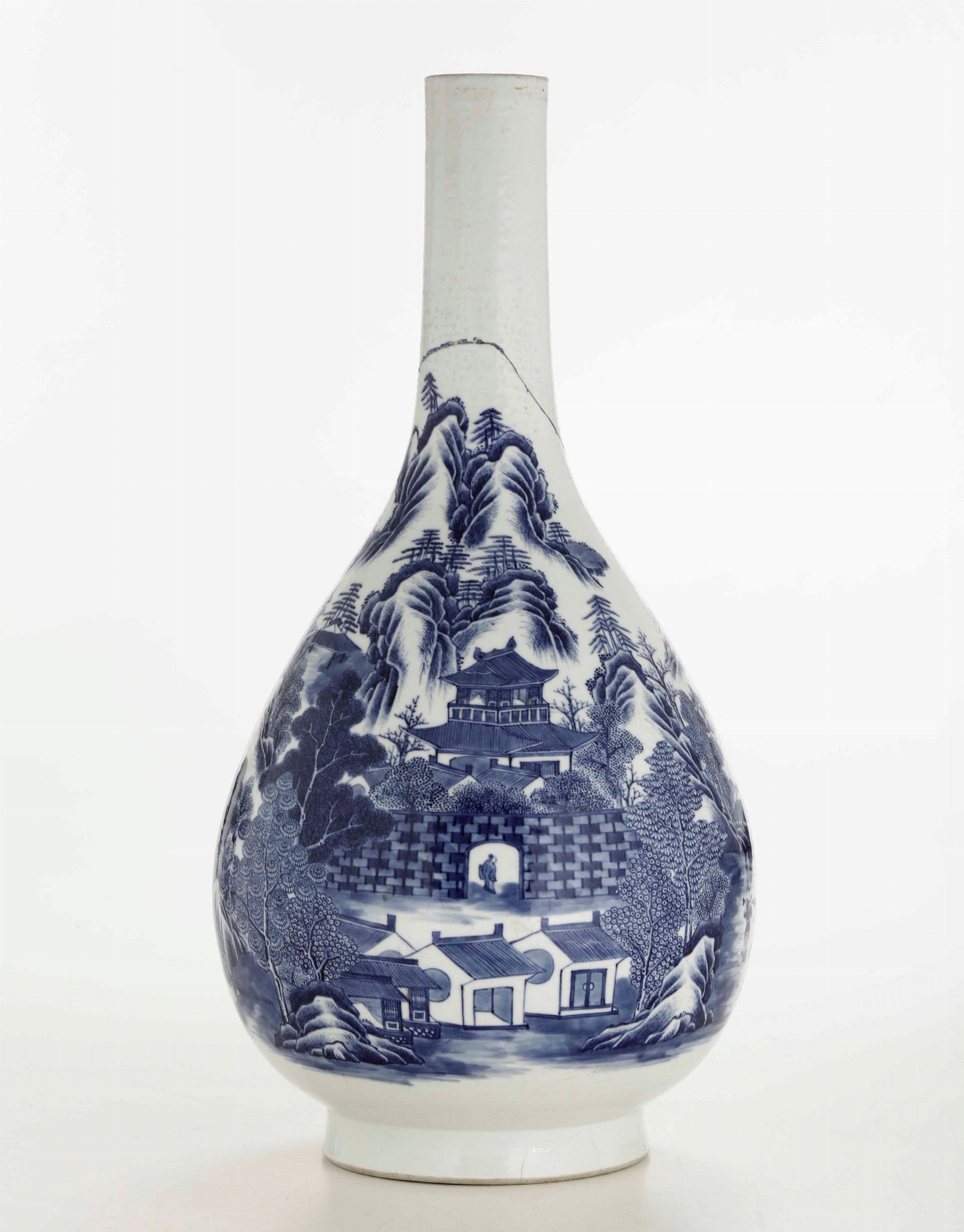 Grande vaso a bottiglia in porcellana bianca e blu con raffigurazione di figure [..]