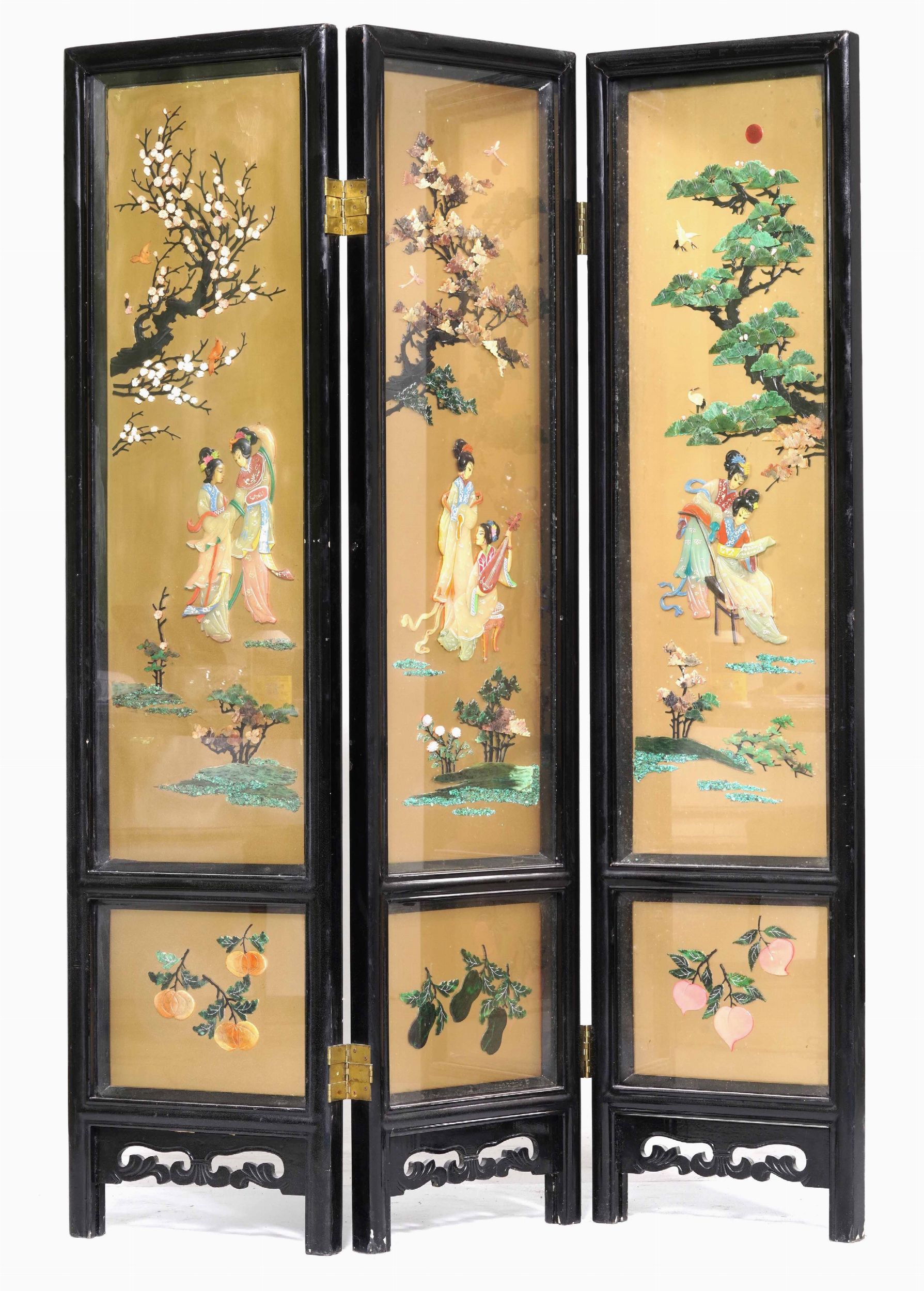 Paravento a tre ante con innesti in pietre dure raffiguranti fanciulle entro paesaggio, [..]