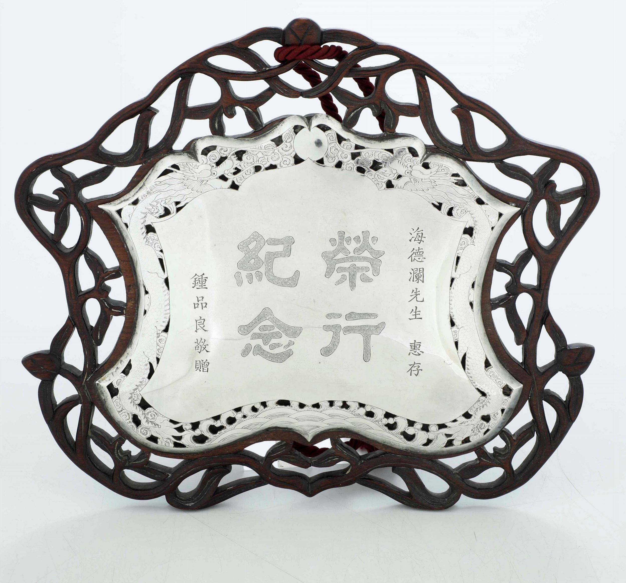 Placca in argento con iscrizioni con cornice in legno, Cina, XX secolo