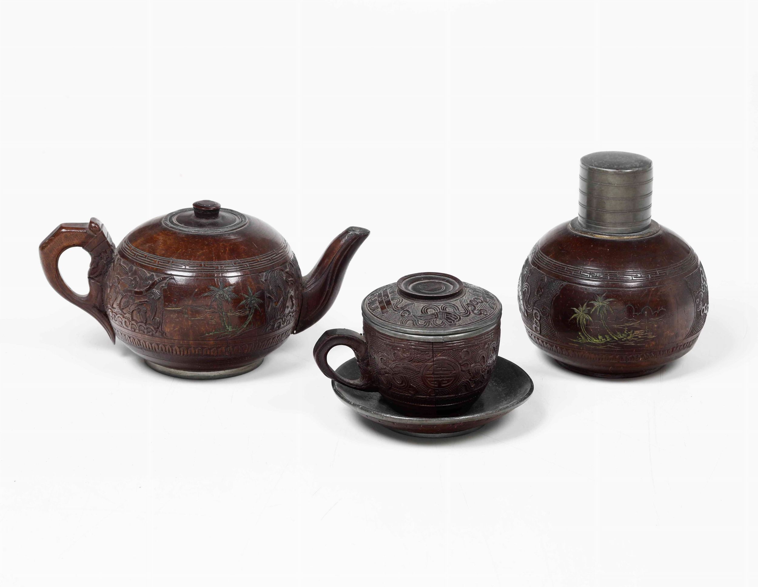 Servizio composto da teiera, tazza con piattino e porta thè in legno, Cina, XX s [..]
