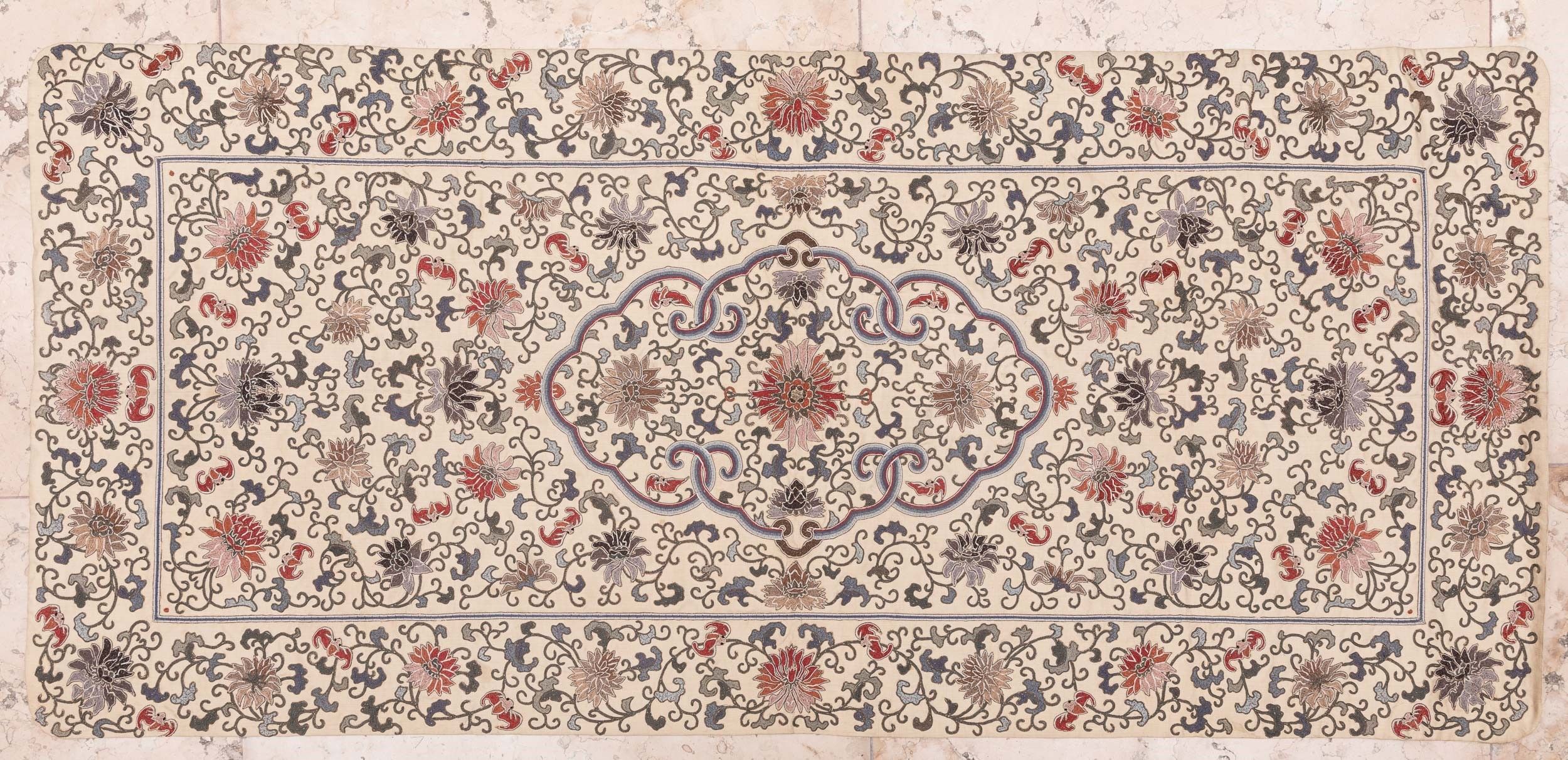 Tessuto in seta finemente ricamato con decoro floreale, Cina, Dinastia Qing, epoca [..]
