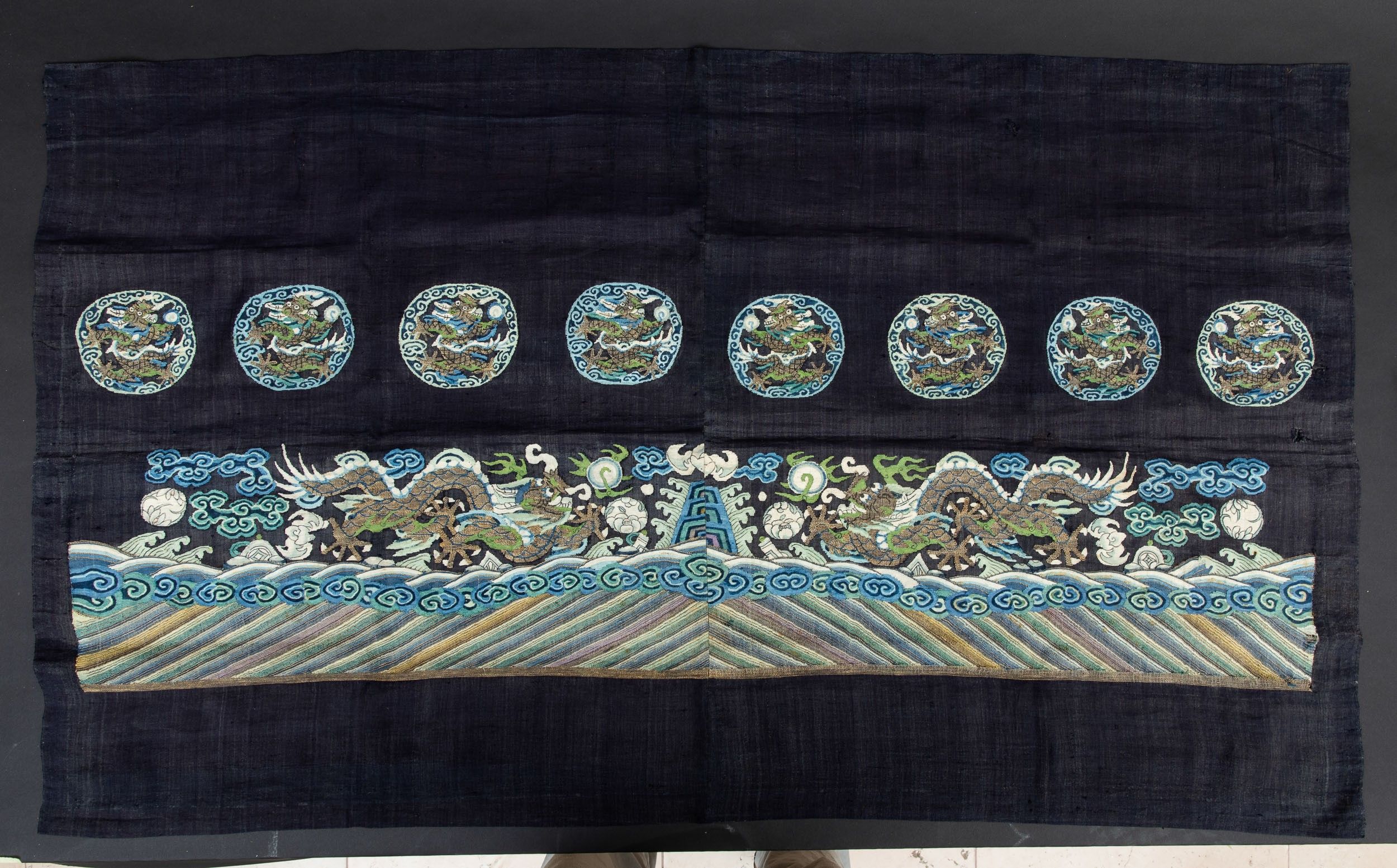 Tessuto in seta ricamato con figure di draghi, Cina, XX secolo