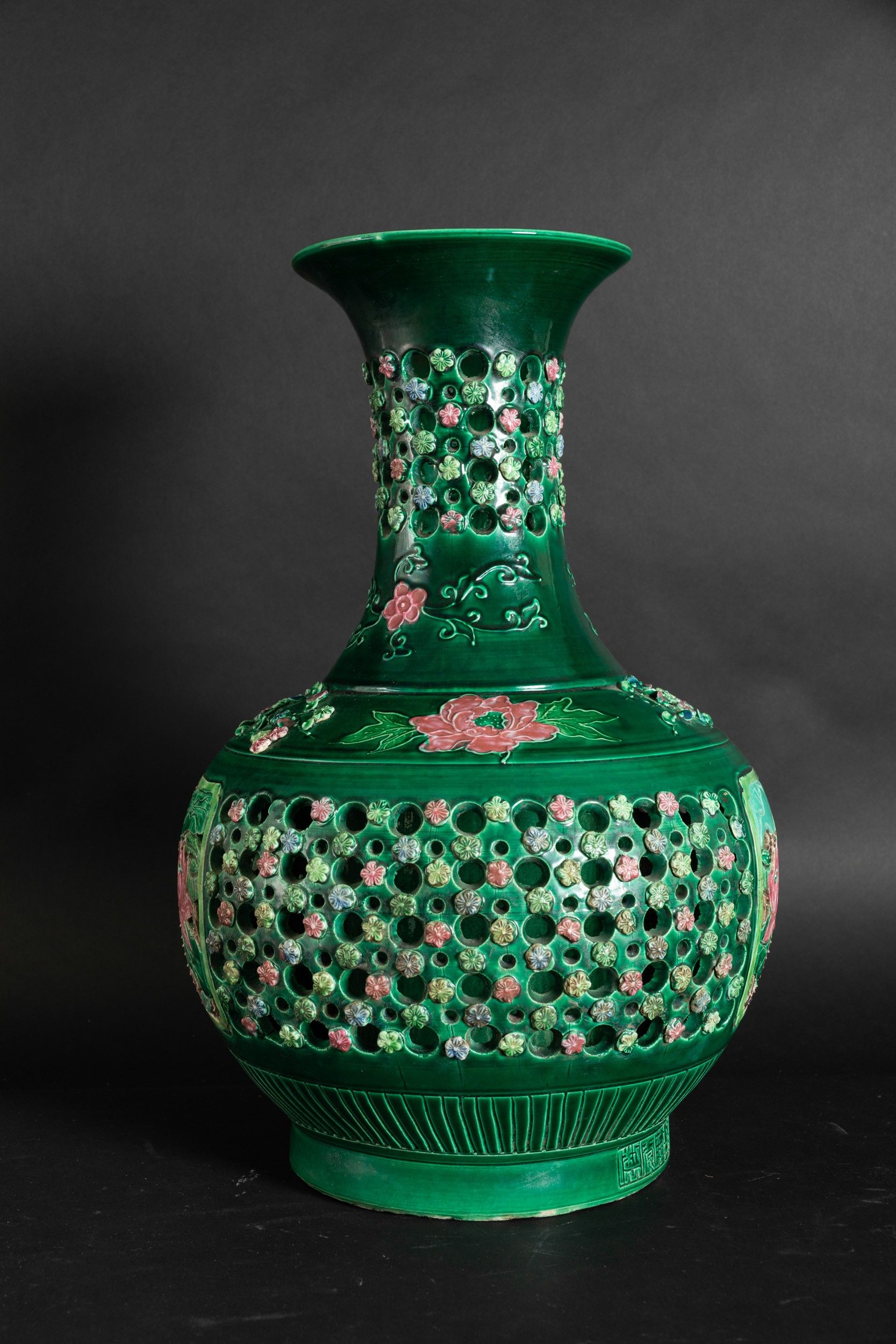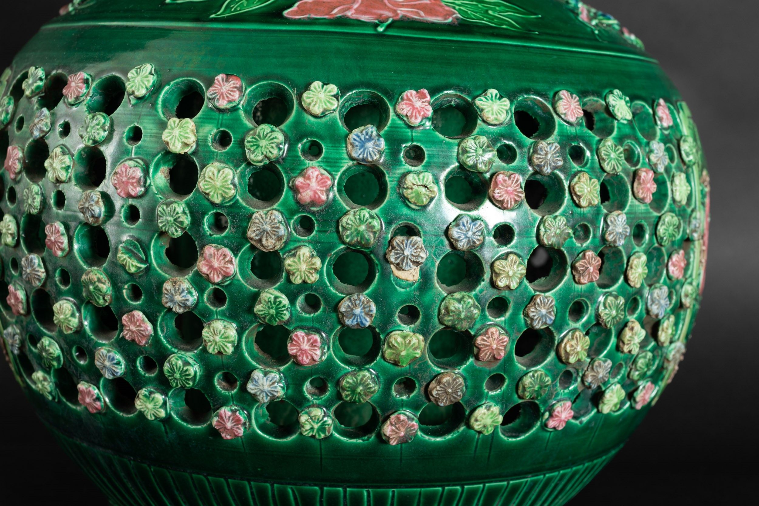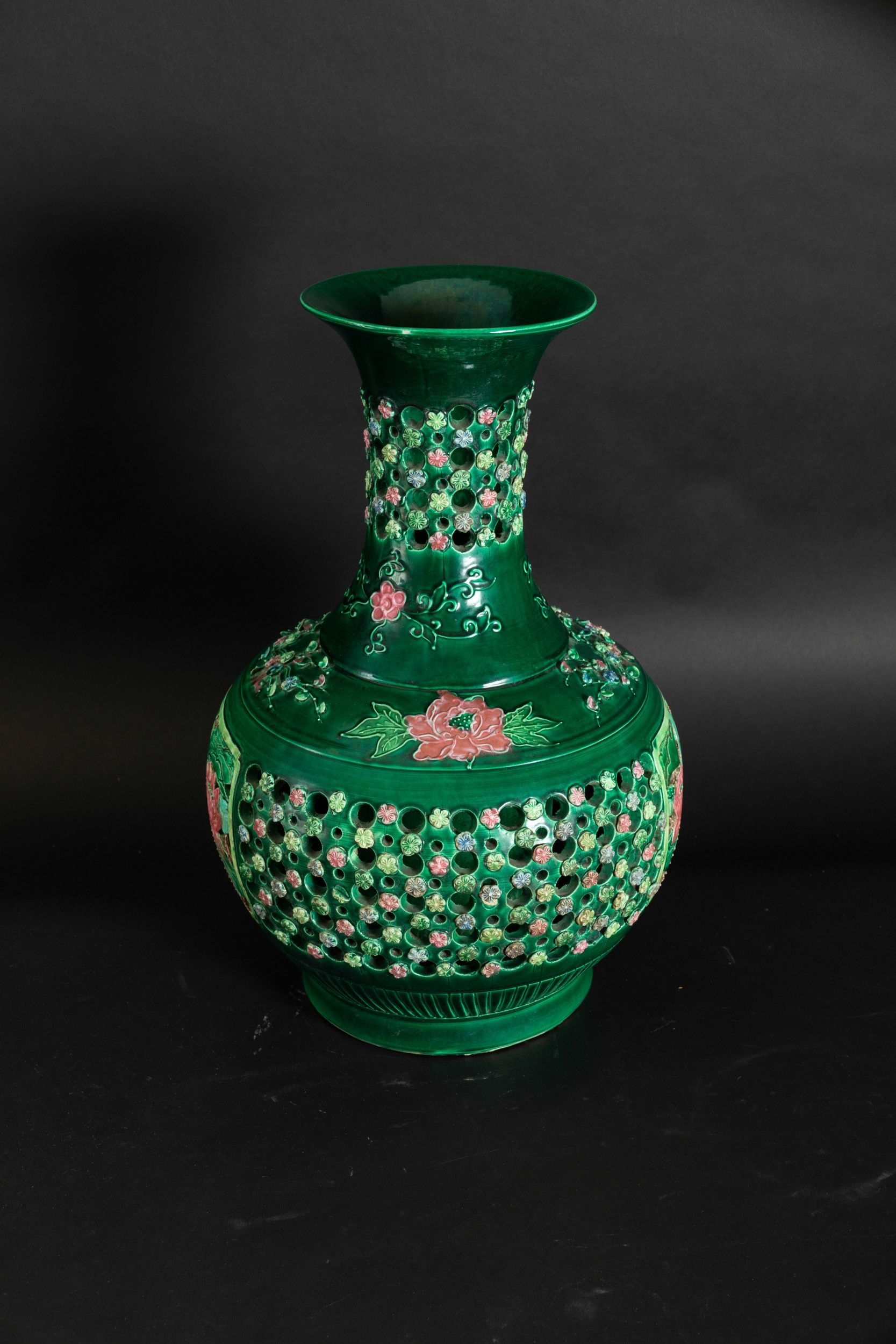 Vaso in grès smaltato verde con decori floreali e naturalistici a rilievo e a traforo, [..]