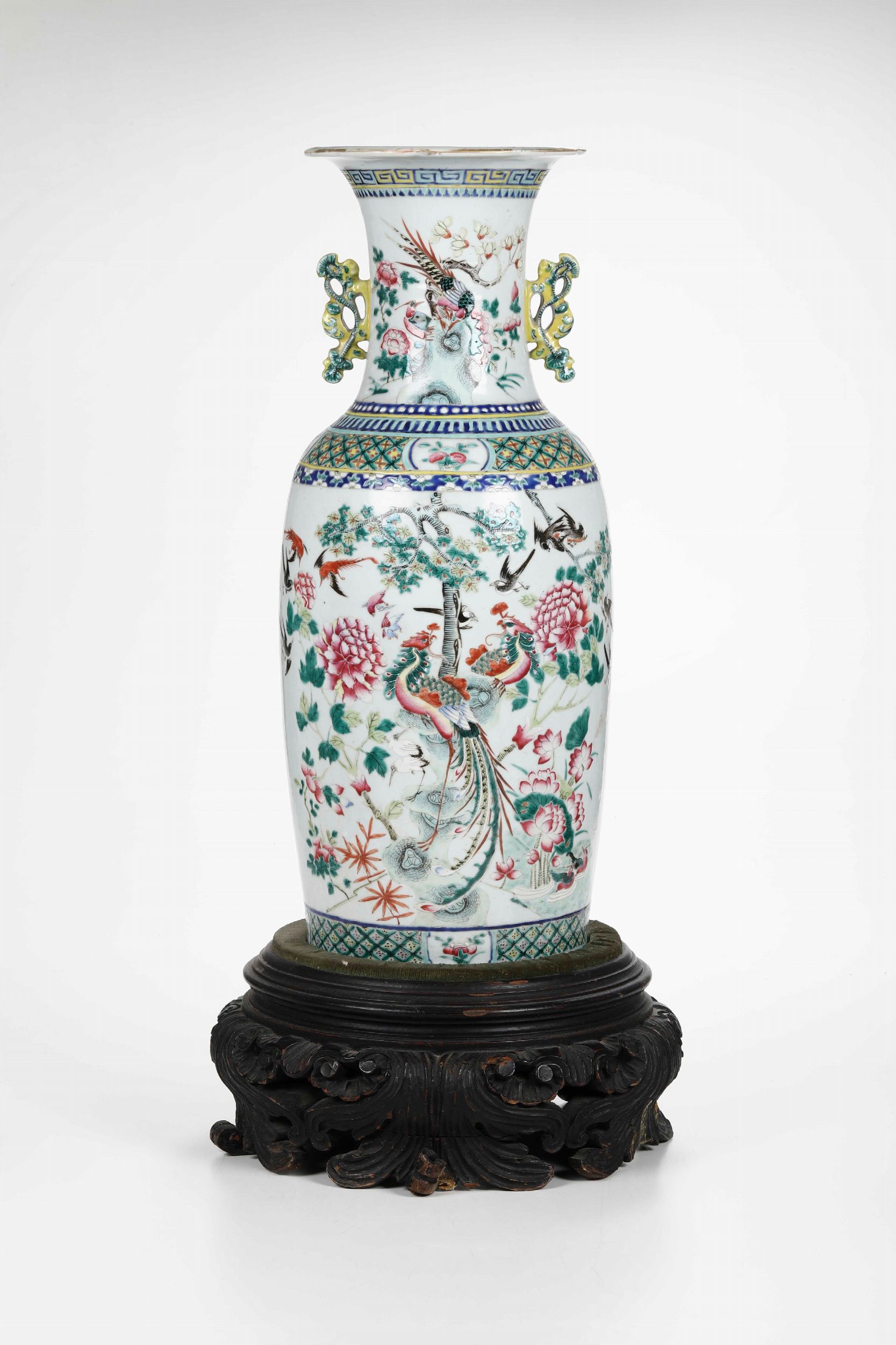 Vaso in porcellana con anse sagomate e figure di fenici tra peonie in fiore, Cina, [..]