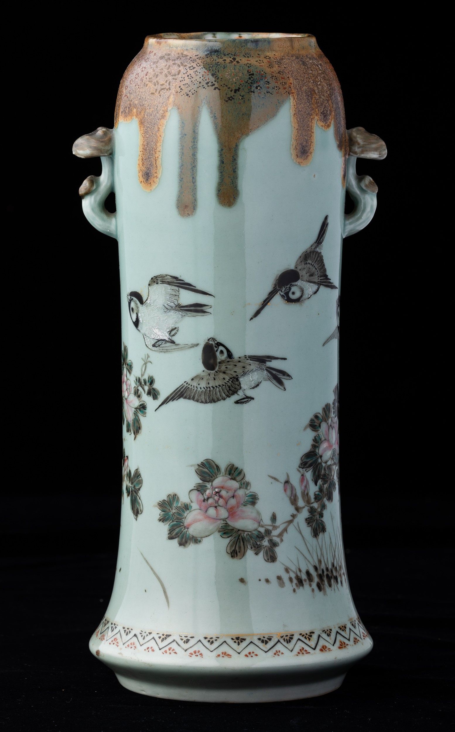 Vaso in porcellana con decoro di uccellini tra i rami su fondo Claire de Lune e [..]