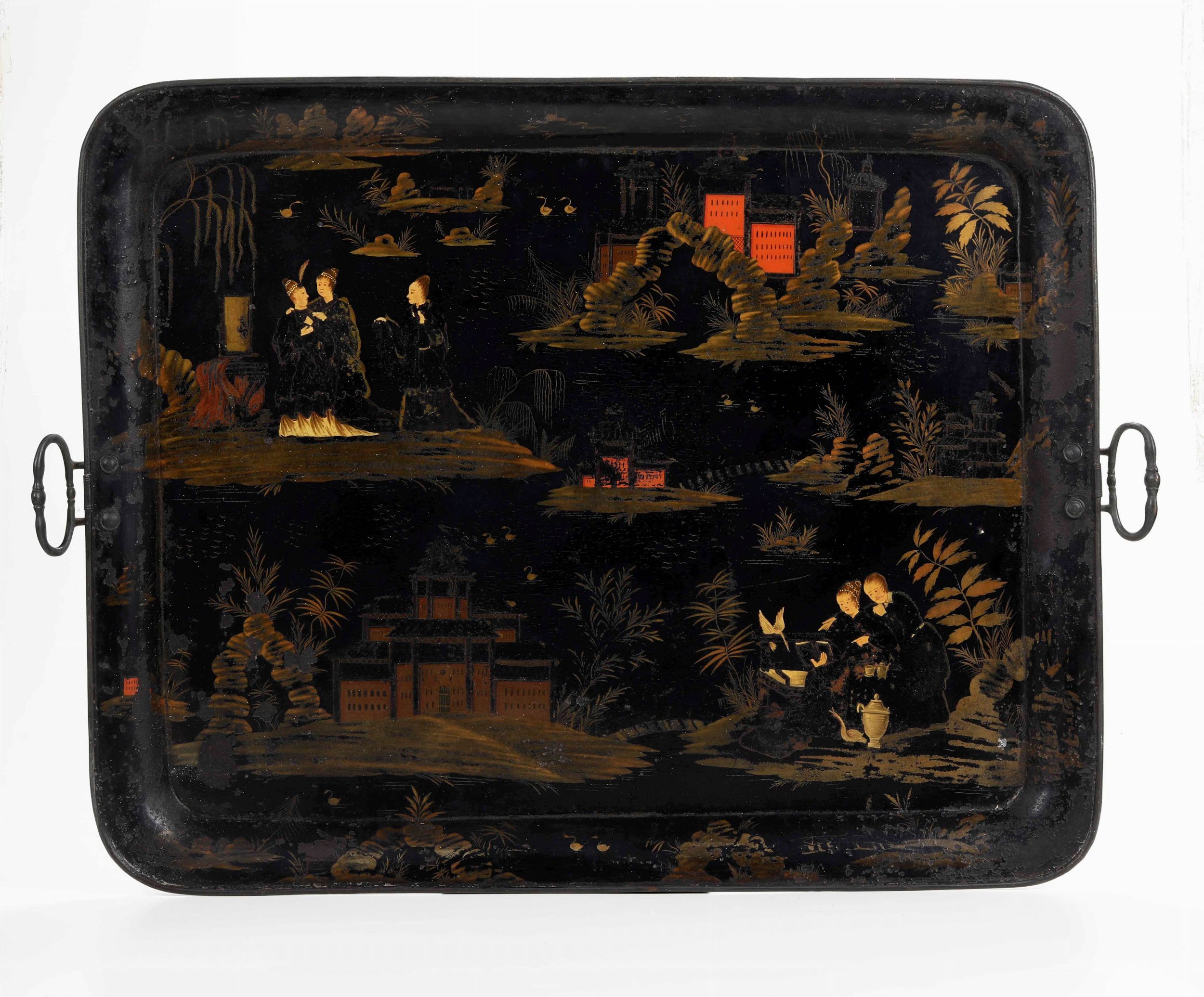 Vassoio in legno laccato con paesaggi e figure, Cina, Dinastia Qing, XIX secolo