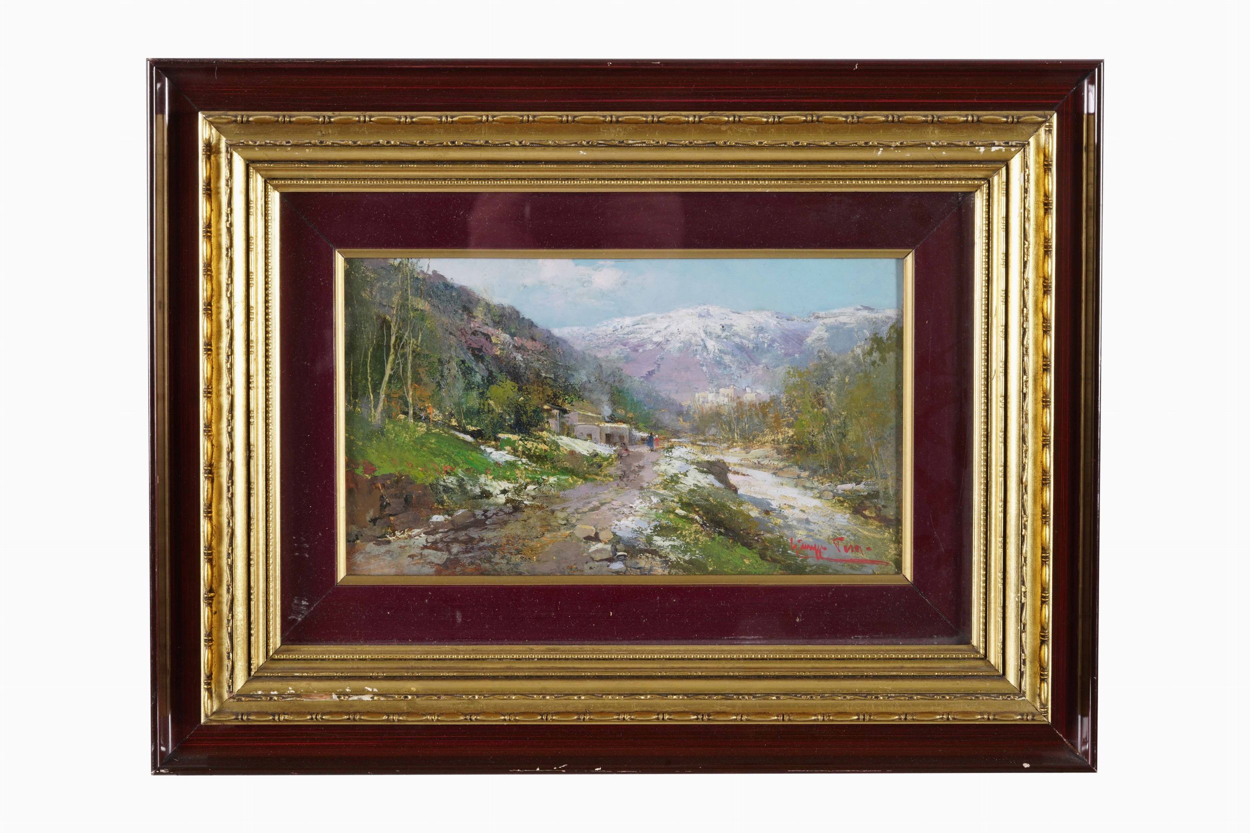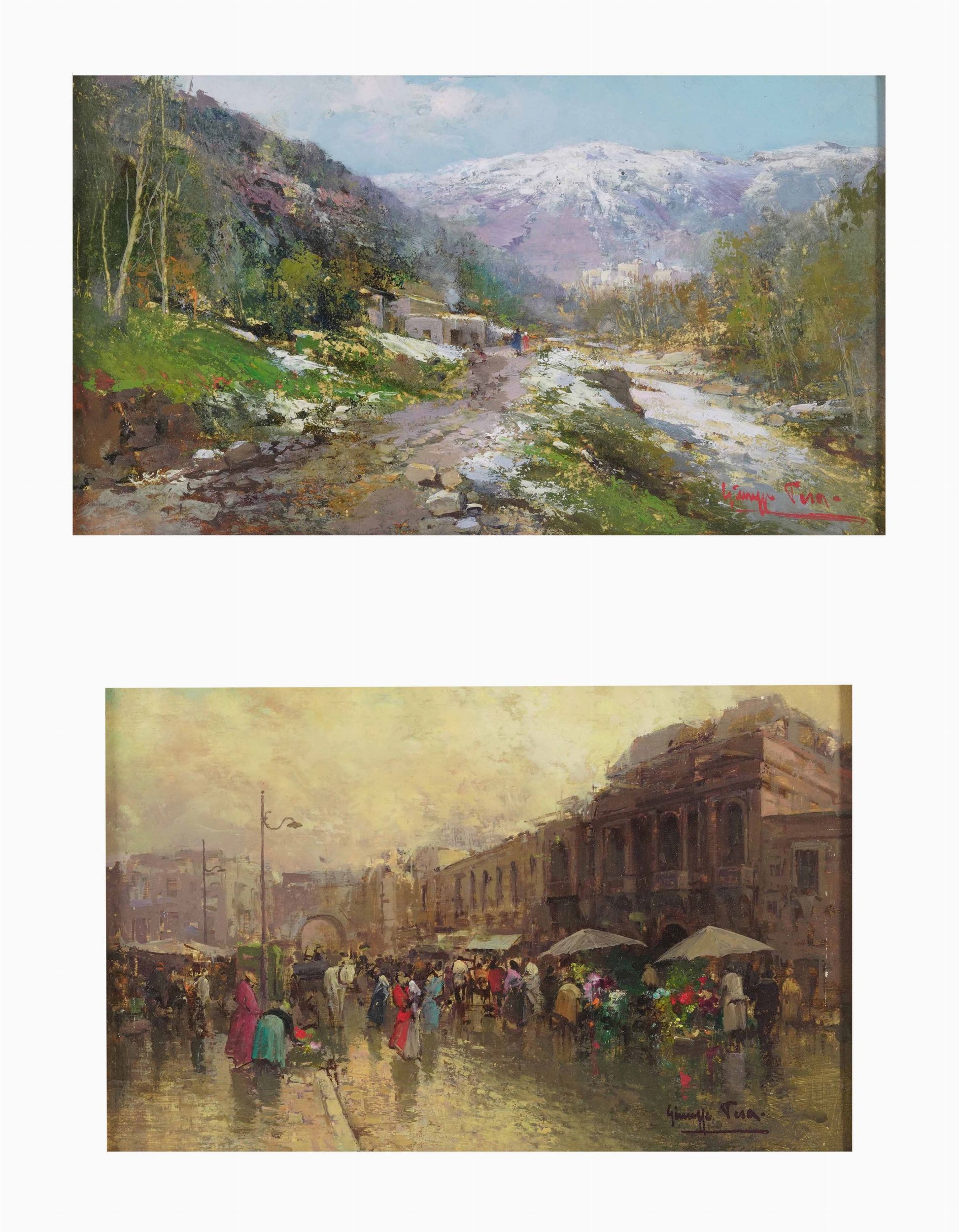Paesaggio montano e scena di mercato