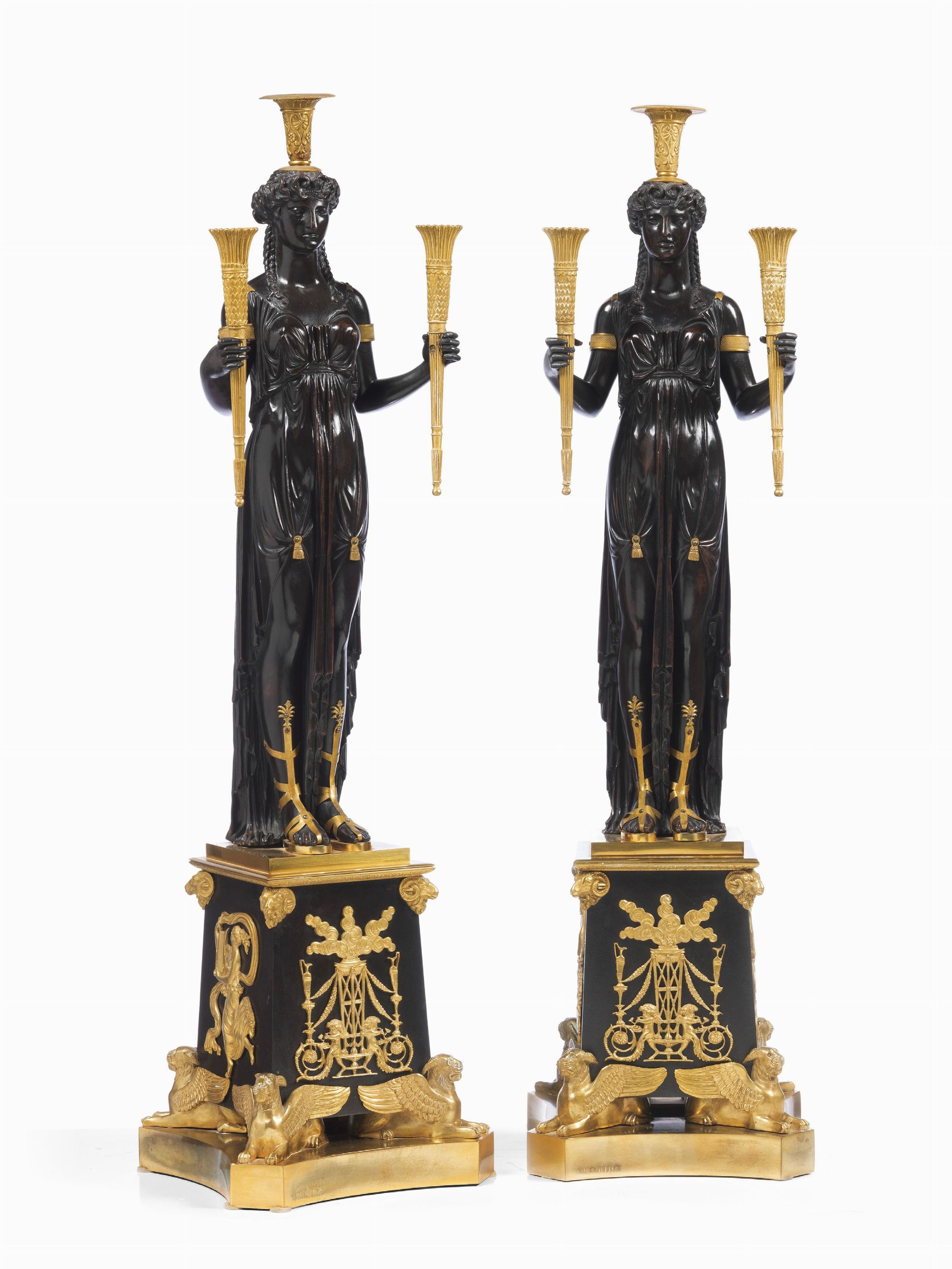 Coppia di candelabri scultorei in bronzo dorato e brunito in stile neoclassico