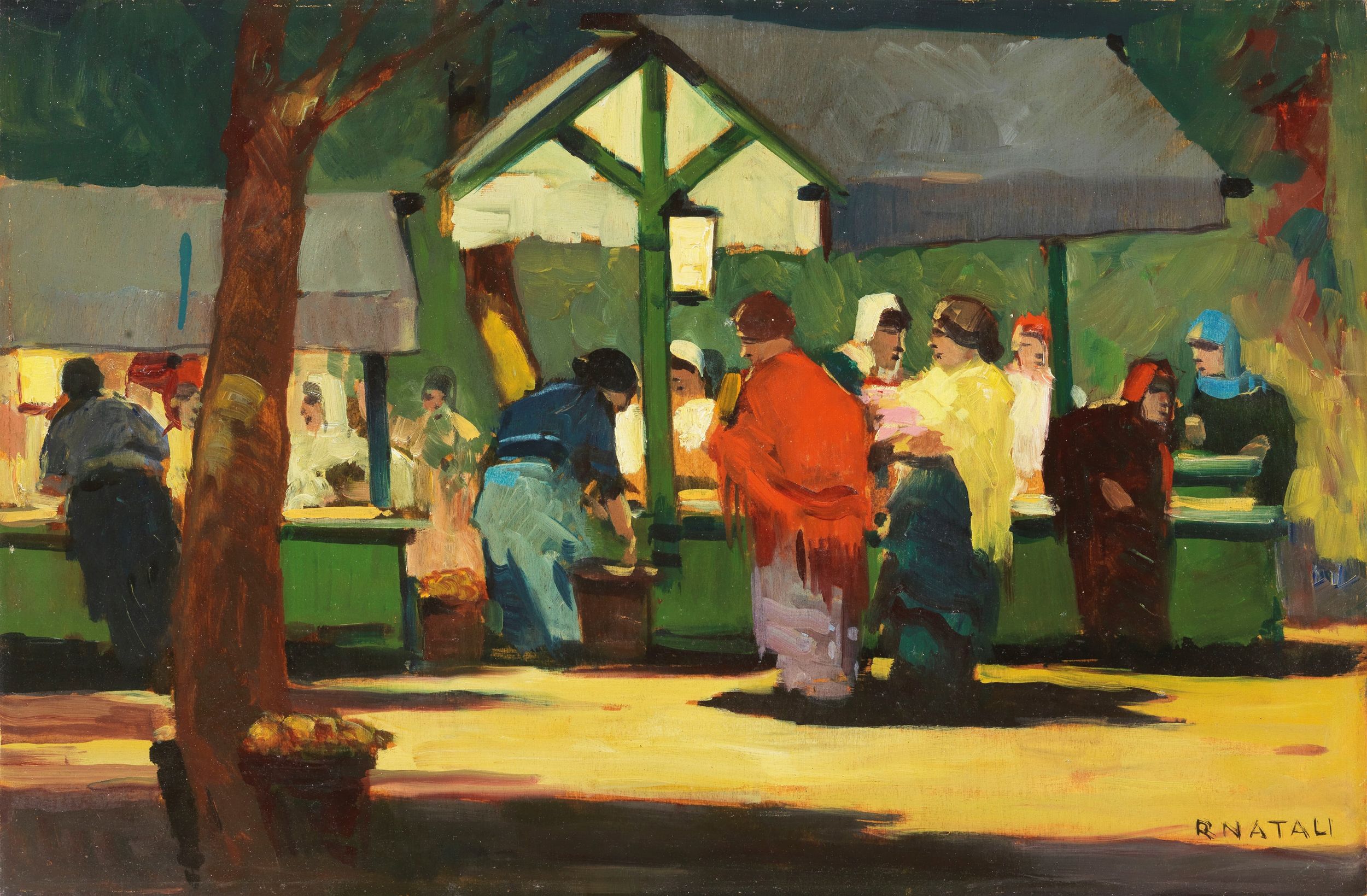 Olio su compensato, cm. 40x60 1930 ca. Firma in basso a destra: R Natali; firma al verso: Renato Natali: dichiarazione di autenticità di Renato Tassi: scritta: Livorno / Piazza Cavallotti / Mercato Mercerie Giocattoli: etichetta Archivio Renato Natali, con n. 318, codice ZLMDQBZTO, con data 21/12/2022: cartiglio con n. 229 e quattro timbri Raccolta Ugo Ughi, Livorno.