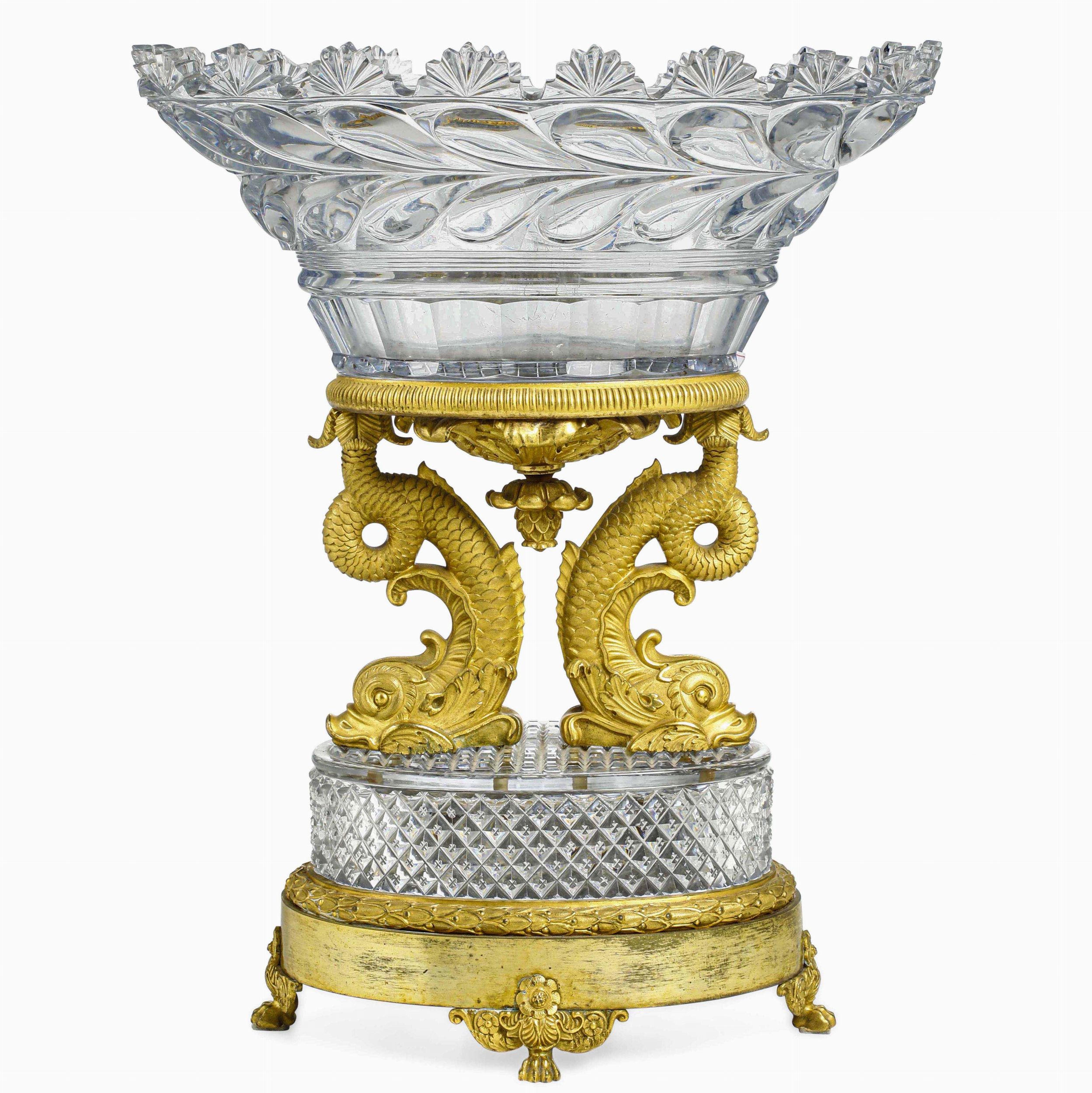 Centrotavola in bronzo fuso, dorato e cesellato e cristallo molato. Francia XIX [..]