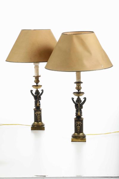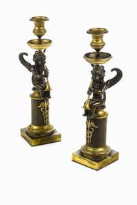 Coppia di candelieri. Bronzo fuso, brunito e dorato, Francia XIX secolo