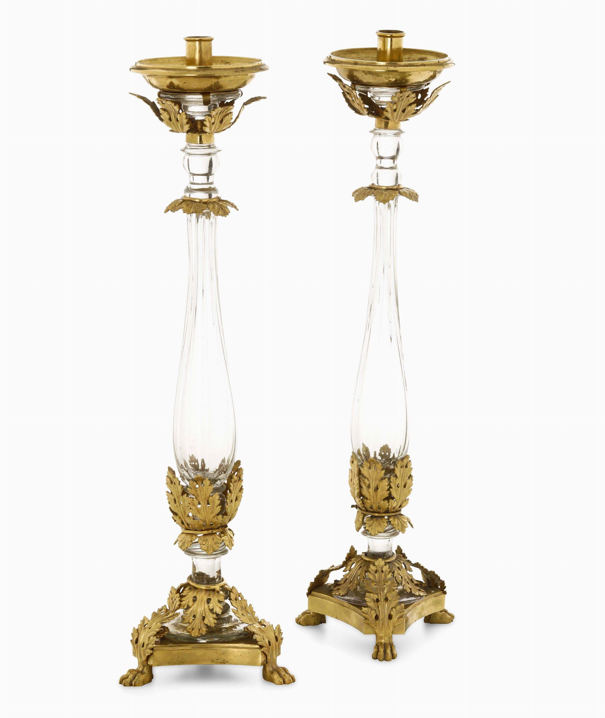 Coppia di candelieri. Vetro e bronzo dorato. Manifattura italiana del XX secolo