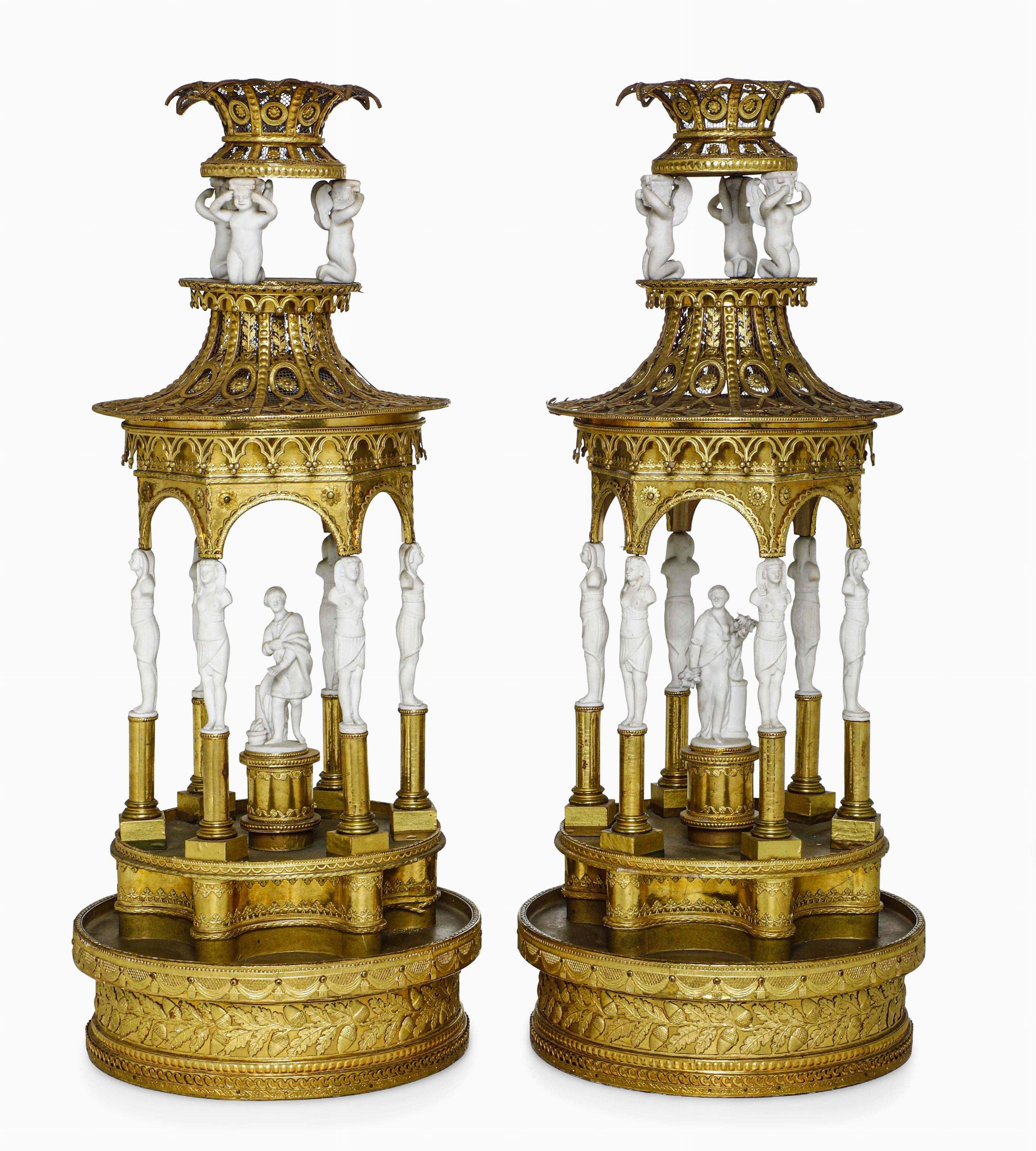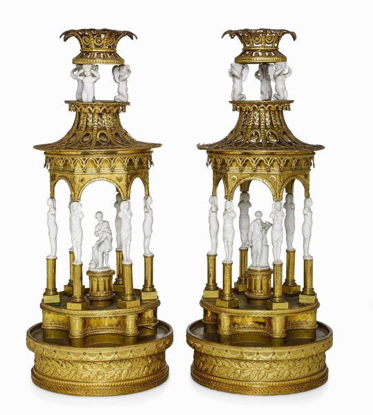 Coppia di eleganti surtout de table a foggia architettonica. Cartapesta dorata e [..]