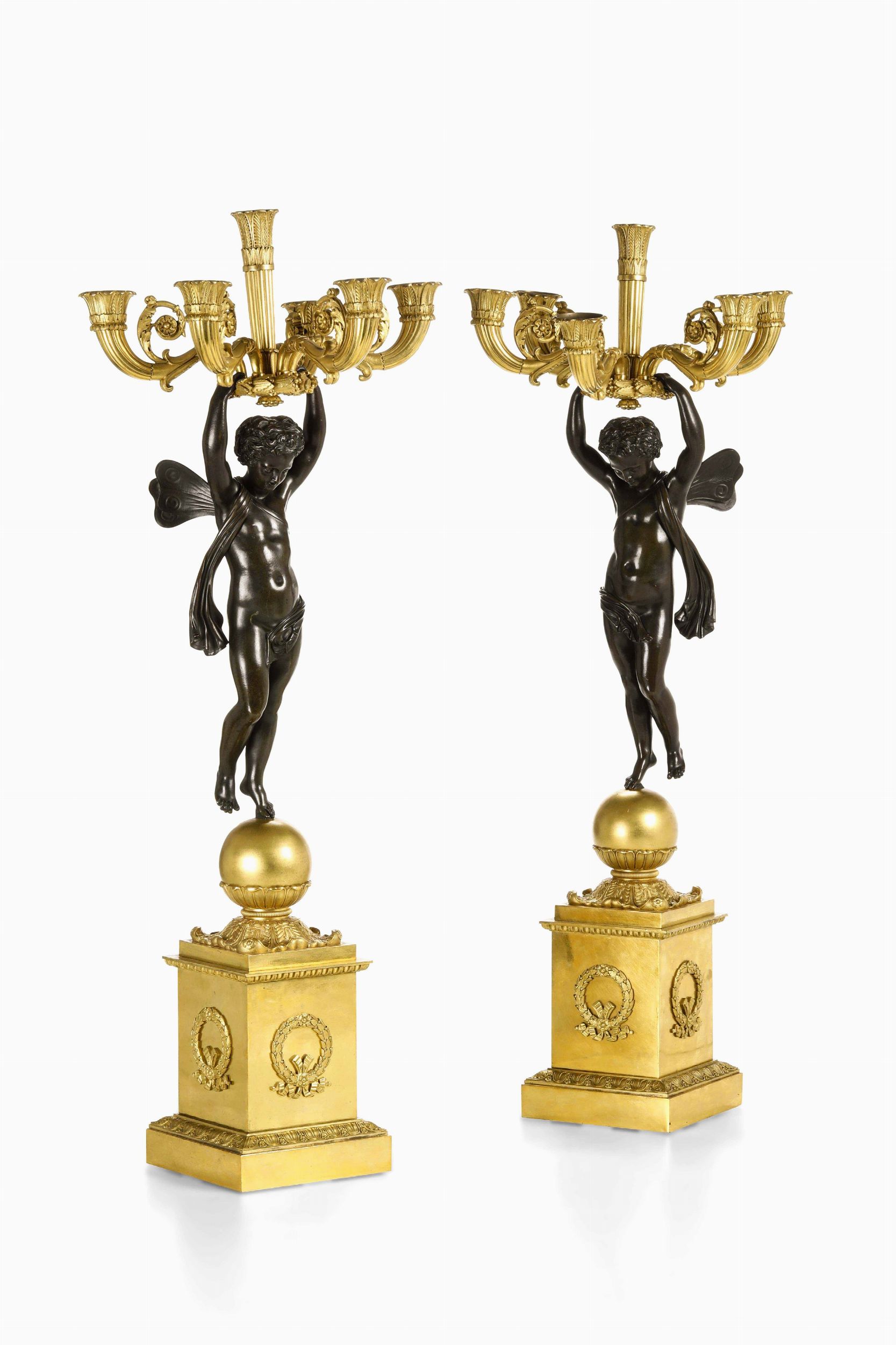 Coppia di grandi candelabri. Bronzo fuso, cesellato, patinato e dorato. Francia [..]