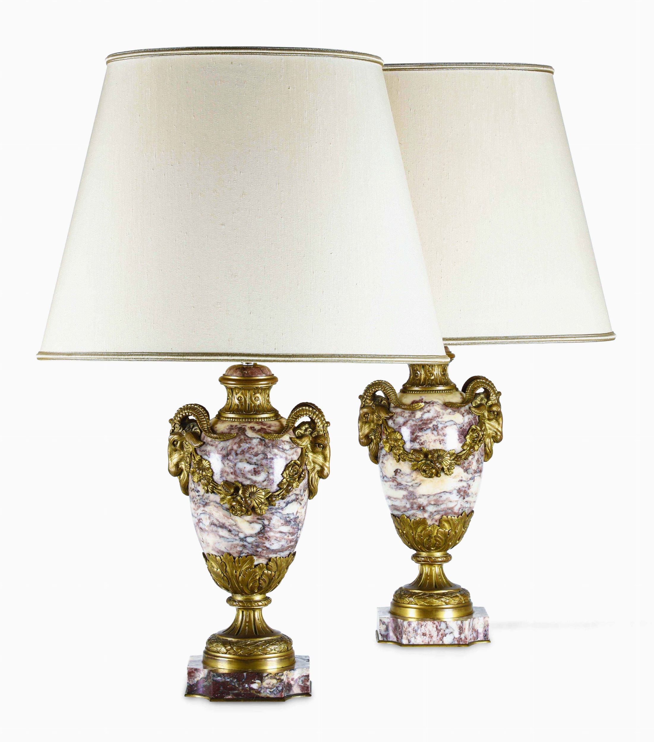 Coppia di lampade. Bronzo fuso e dorato, marmo fior di pesco. Manifattura francese [..]