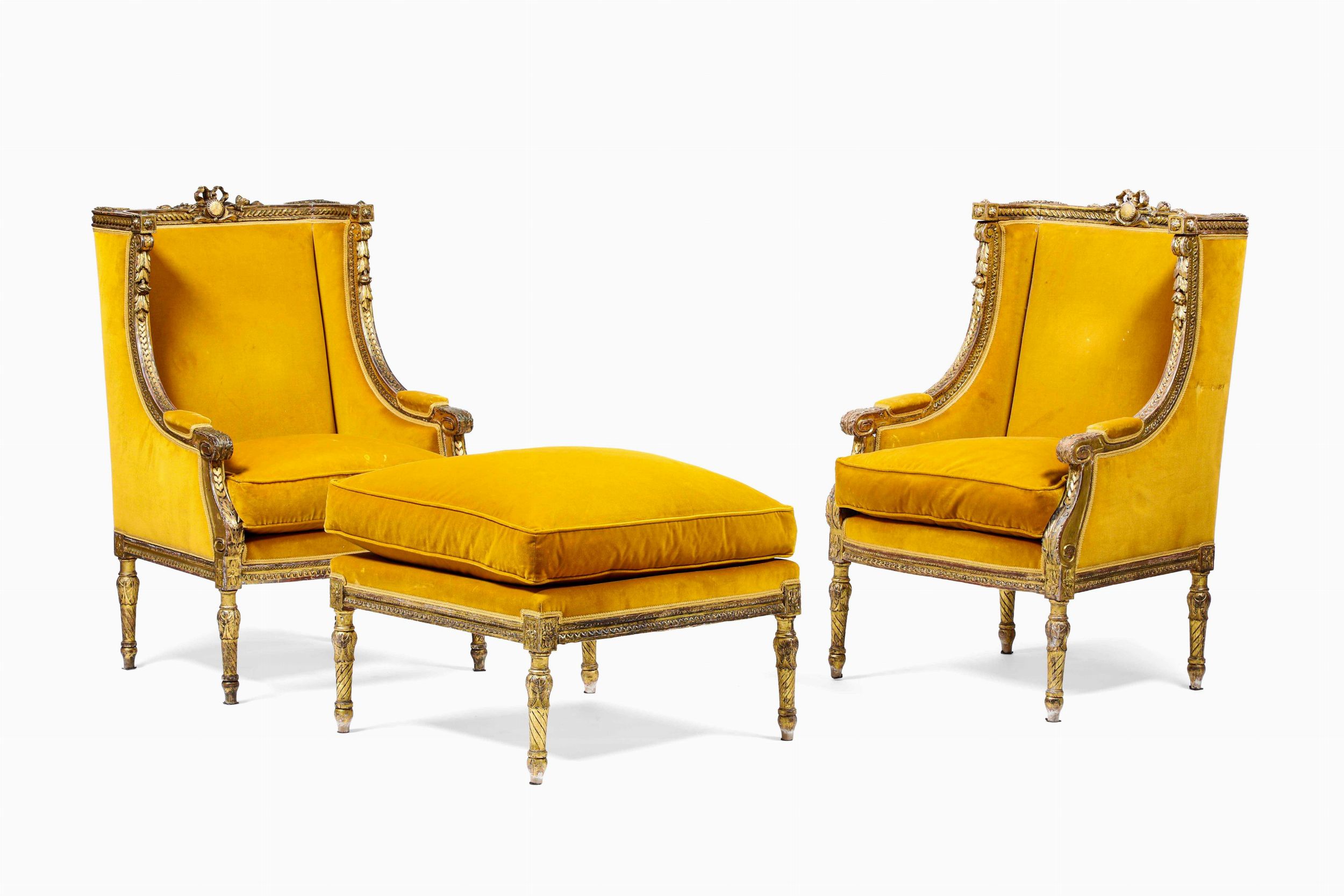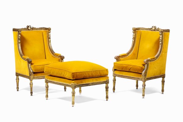 Coppia di poltrone e pouf di gusto Luigi XVI in legno intagliato. XX secolo