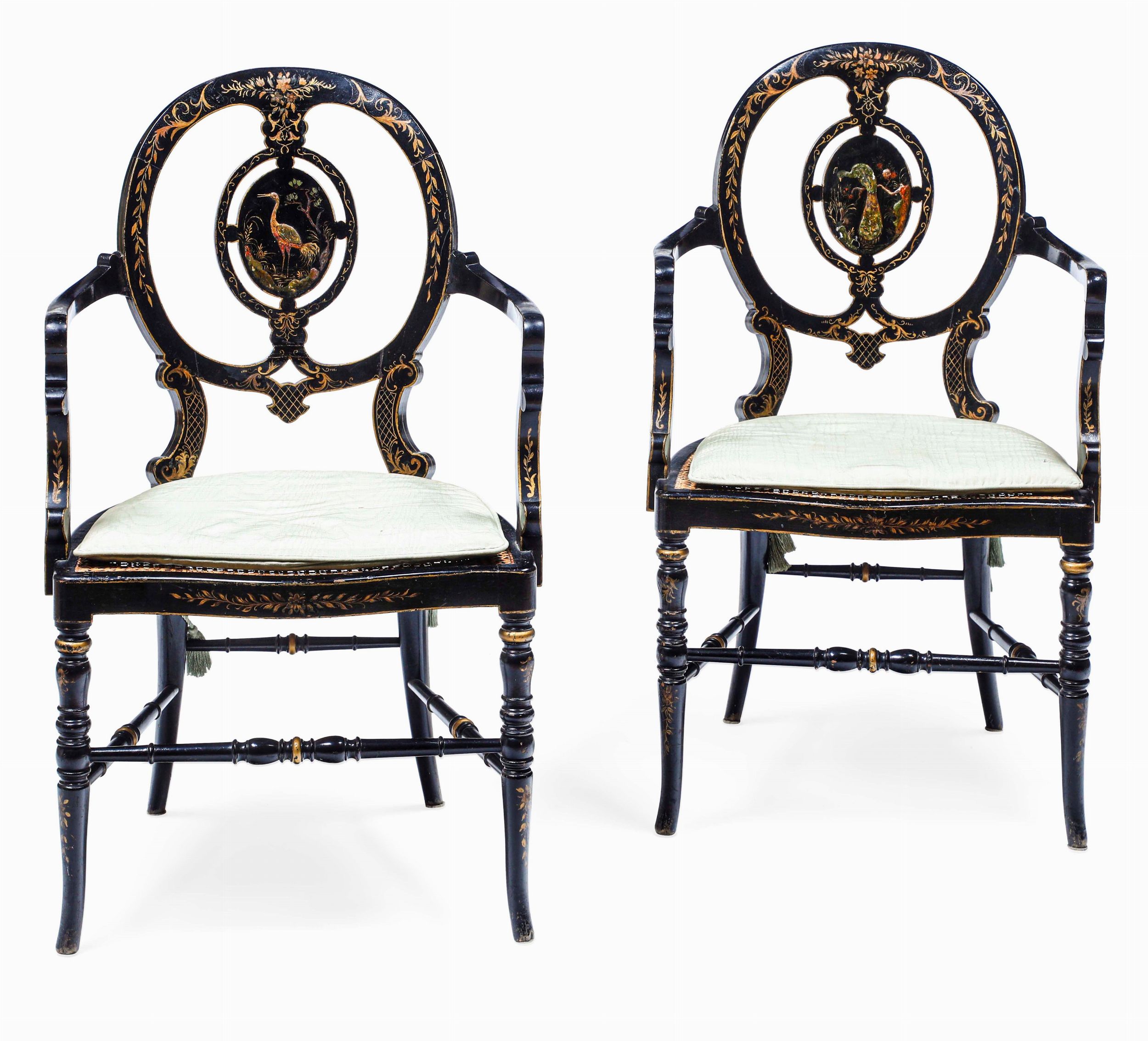 Coppia di sedie con braccioli in legno ebanizzato. XIX secolo