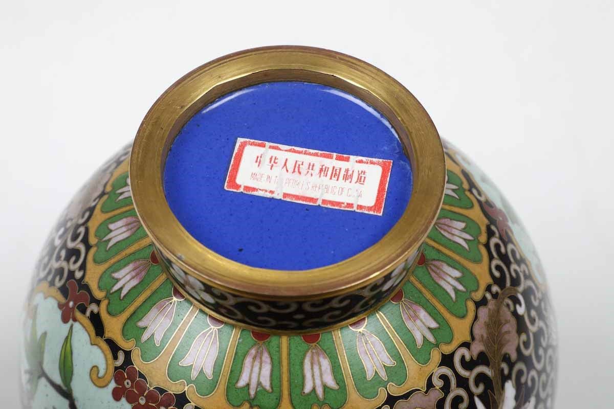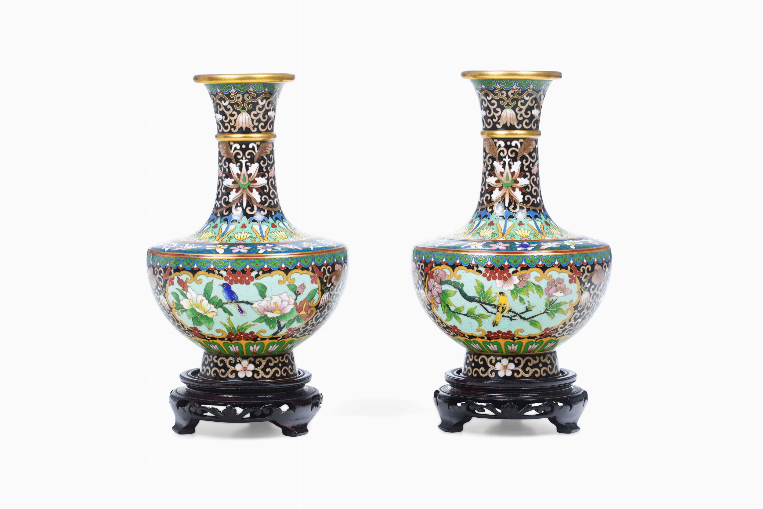Coppia di vasi a bottiglia in smalti con decori floreali e scene naturalistiche [..]