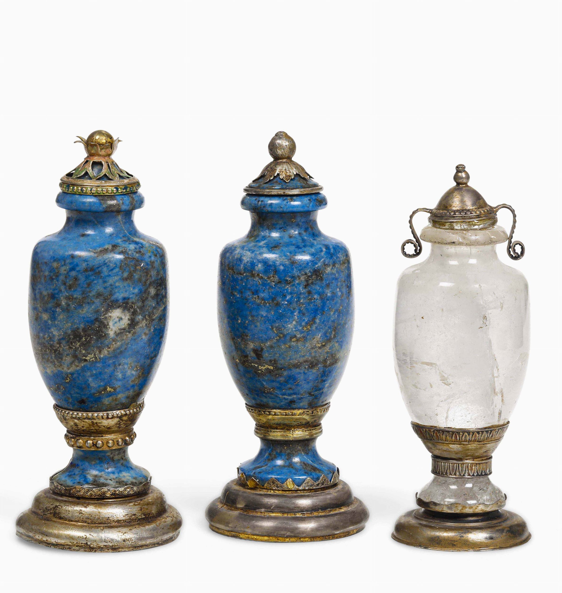 Gruppo di tre vasi in lapislazzuli e cristallo di rocca, XIX - XX secolo