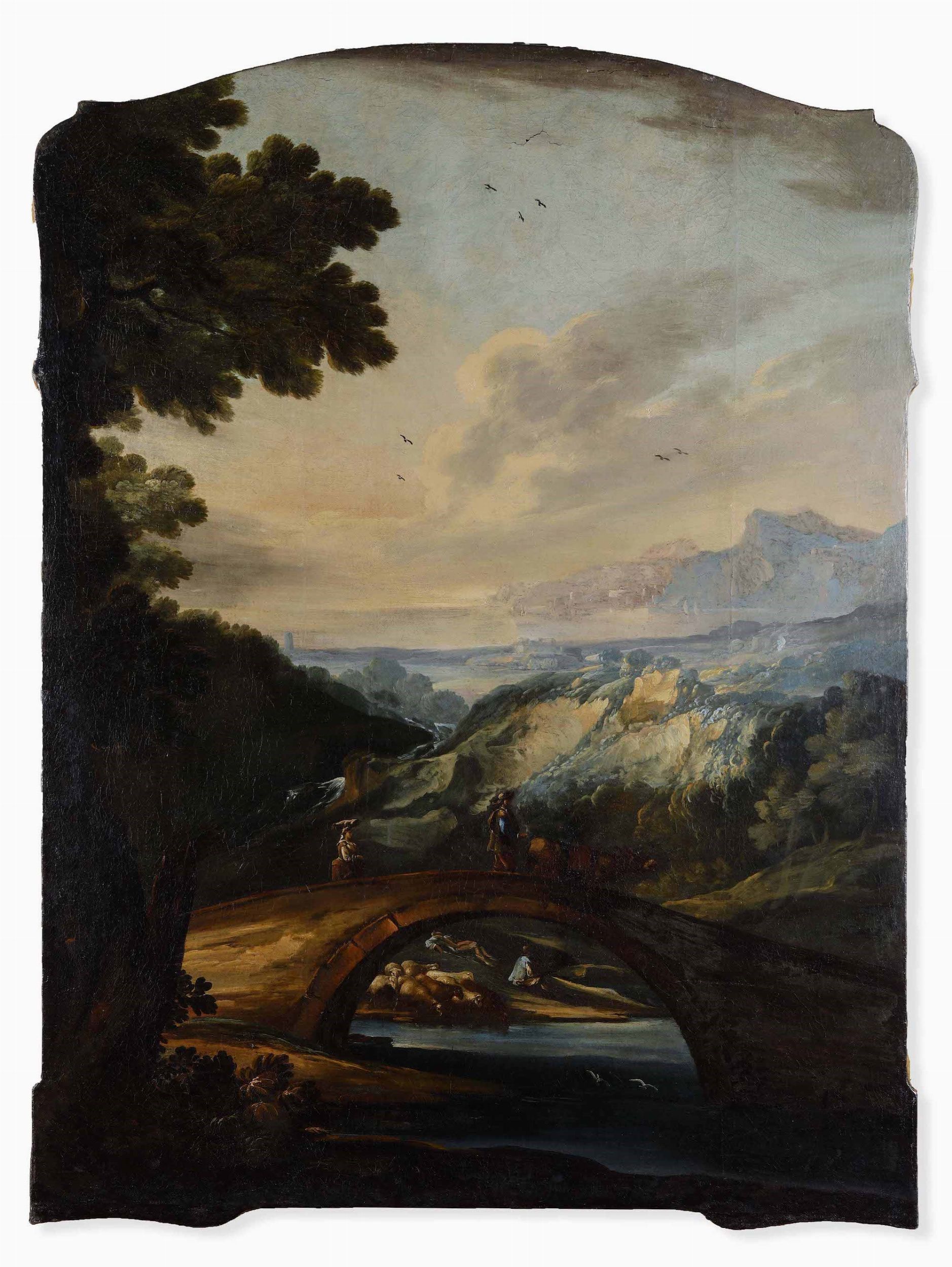 Scuola del XVIII secolo Paesaggio fluviale con ponte e pastori