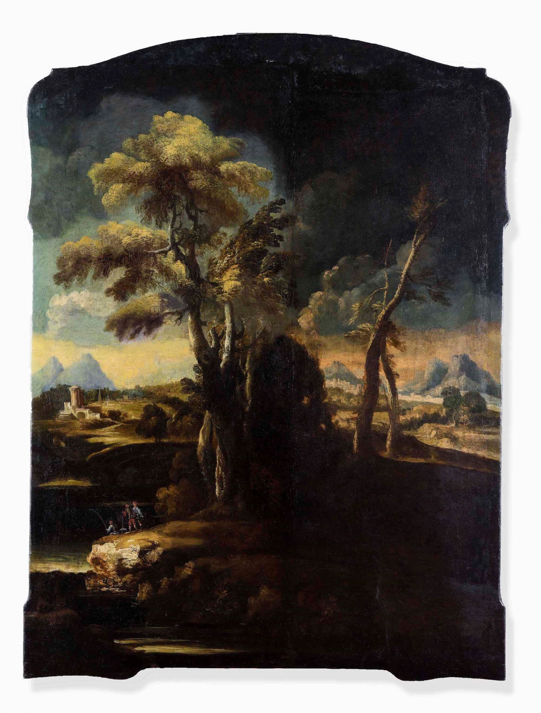 Scuola del XVIII secolo Paesaggio fluviale con pescatori