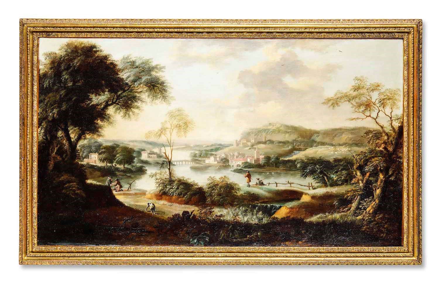 Scuola del XVIII secolo Paesaggio fluviale con pescatori e contadini