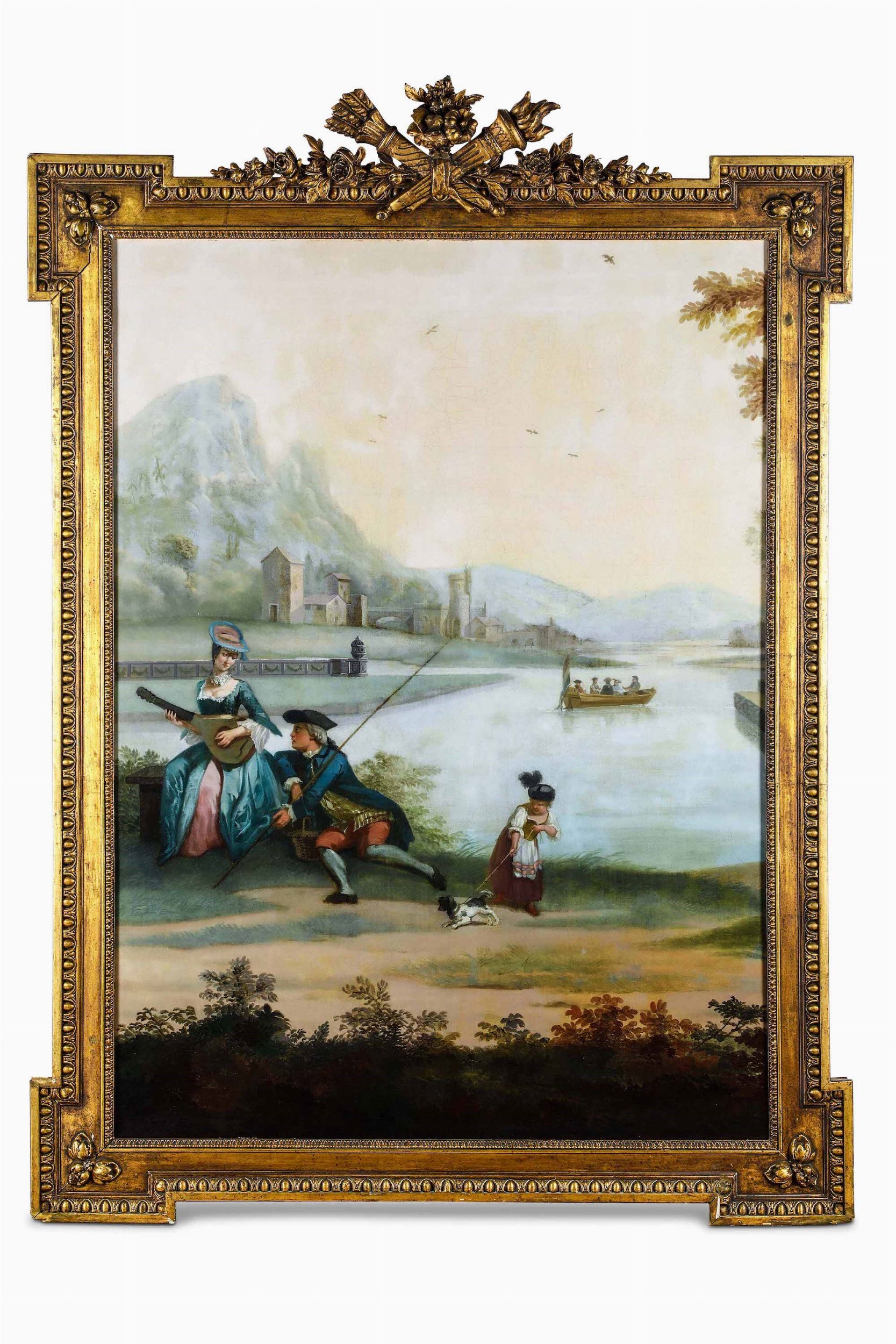 Scuola nord europea del XVIII secolo Scena galante in riva a un fiume