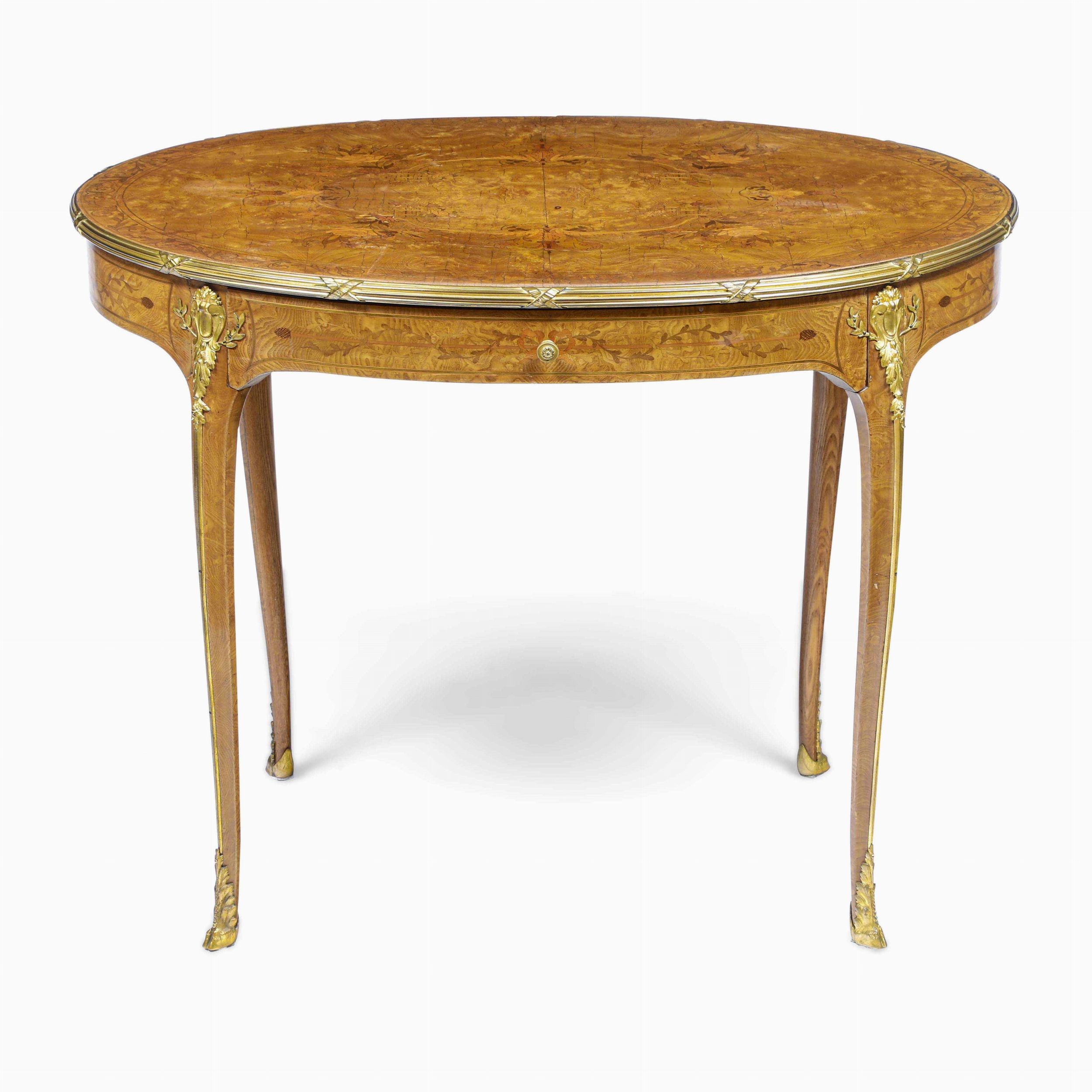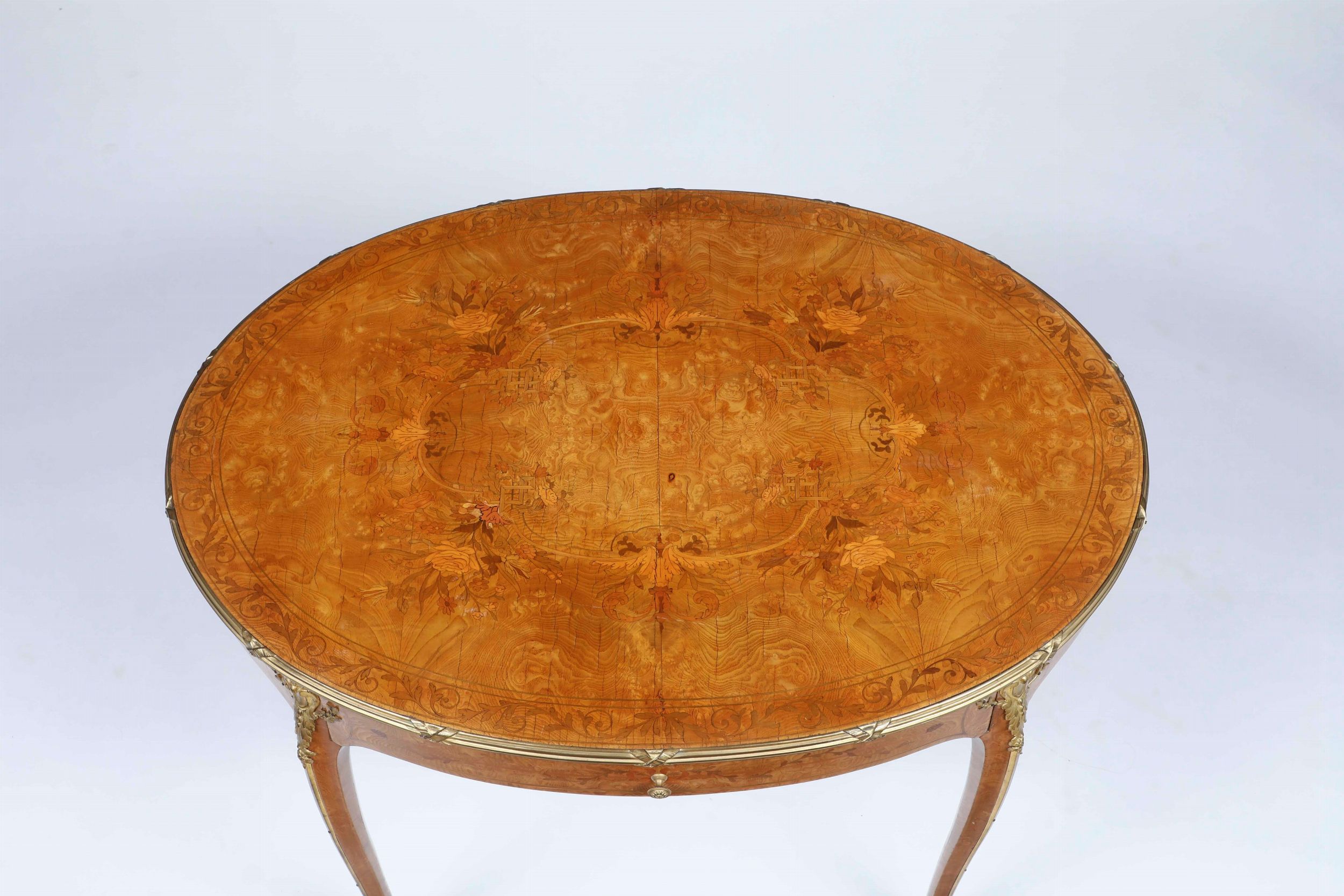 Tavolo ovale lastronato ed intarsiato in varie essenze. XIX secolo