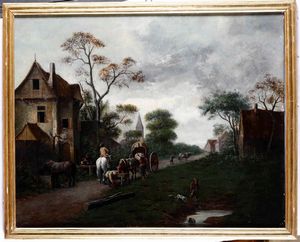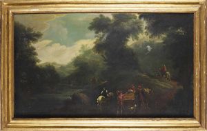 Scuola fiamminga del XVIII secolo Paesaggio con carovana e contadini