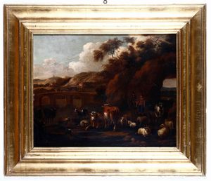 Scuola romana del XVIII secolo Paesaggio con pastori e armenti
