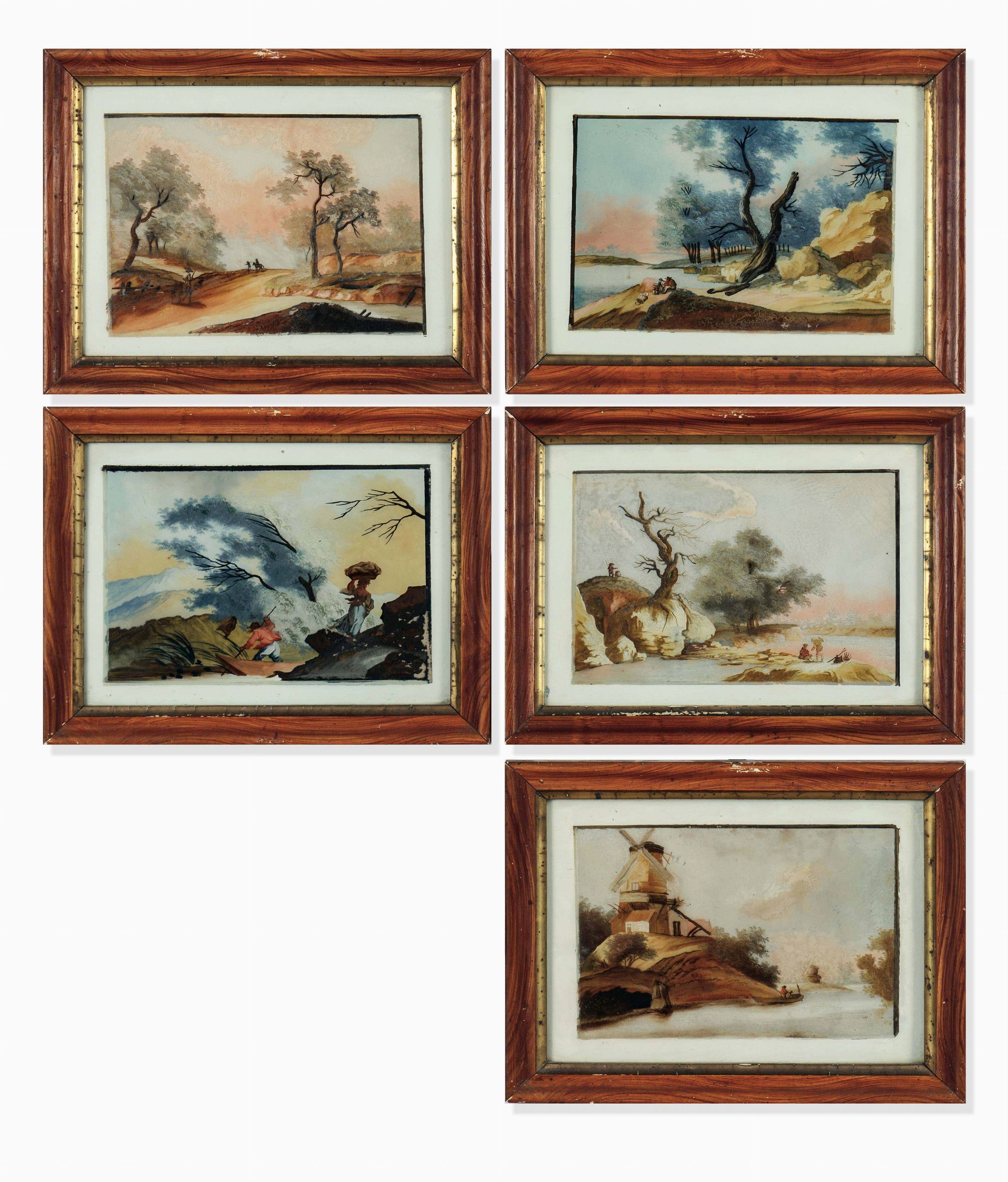 cinque dipinti a olio su vetro, Largh. 26 - Alt. 19 cm