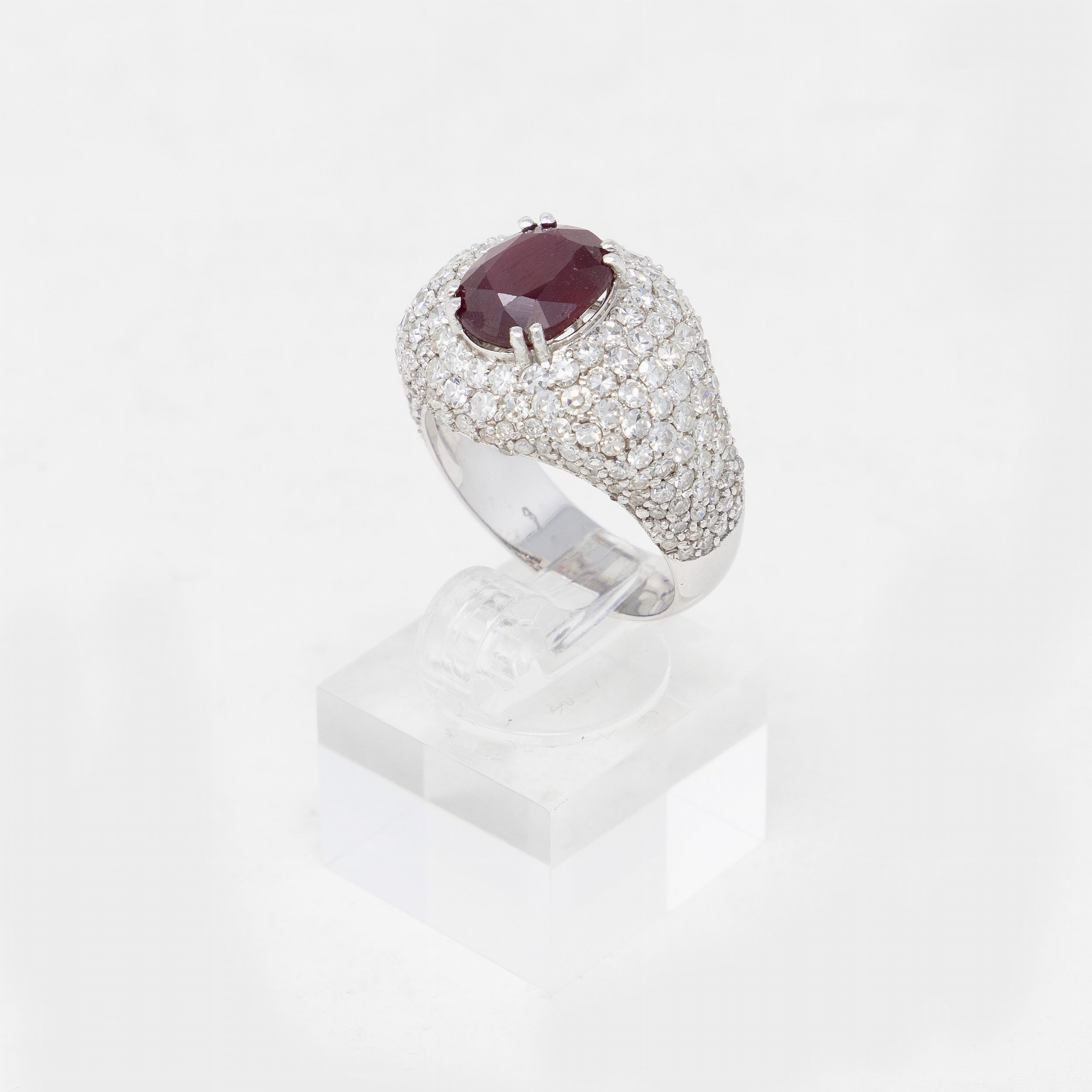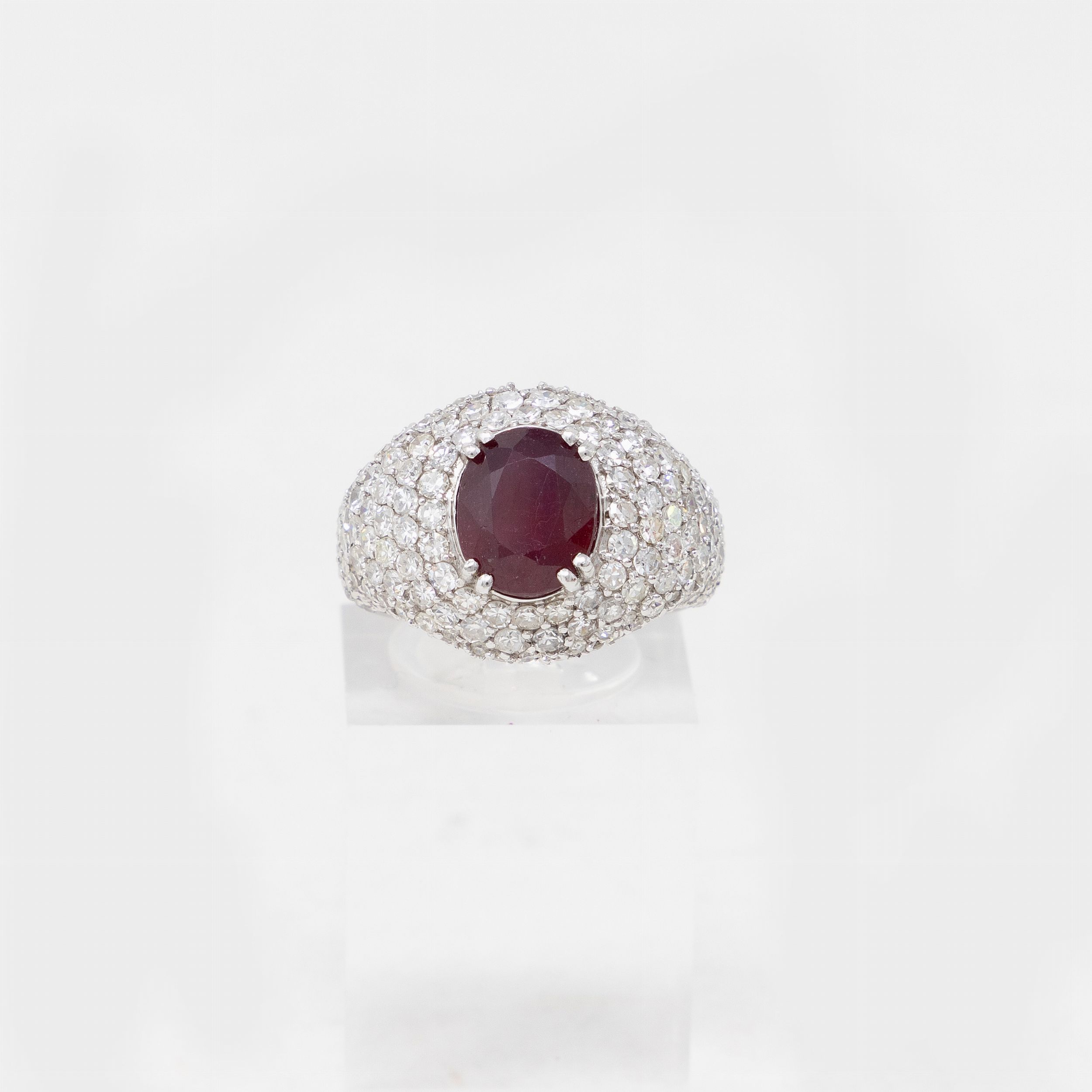 oro 18 kt, rubino kt 3,22, diamanti kt 4,50 ca., misura 18, g 10 ca.