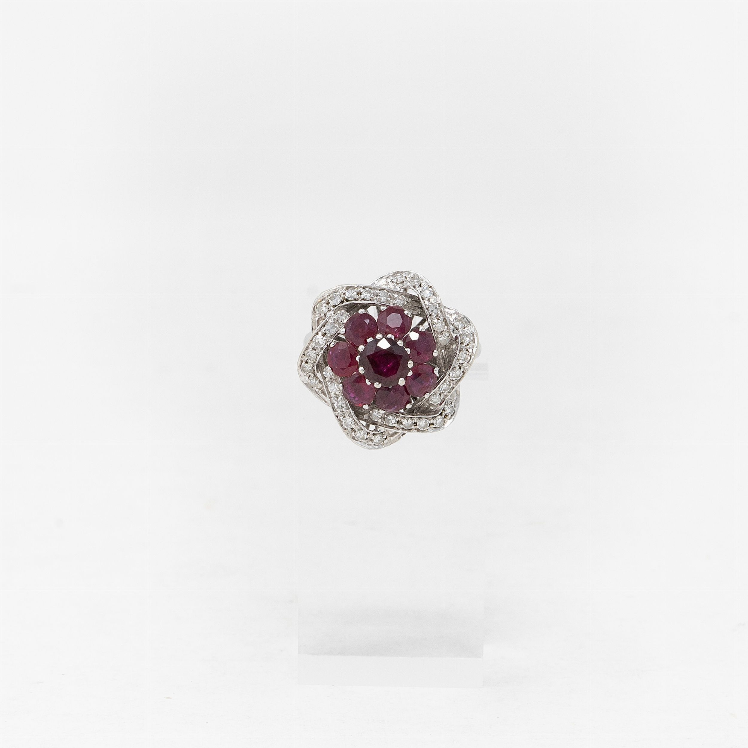 Anello a fiore in oro bianco con rubini e diamanti taglio huit huit