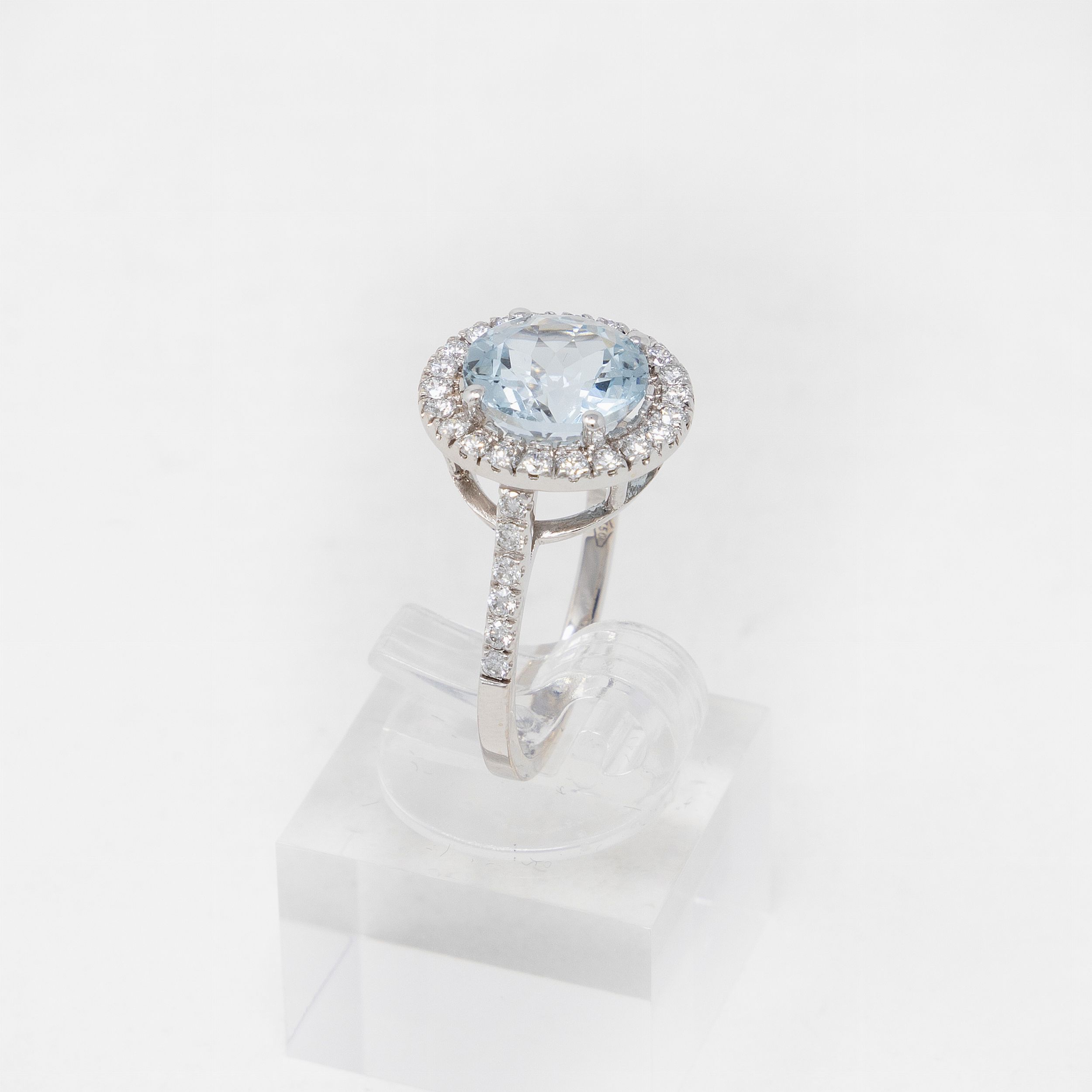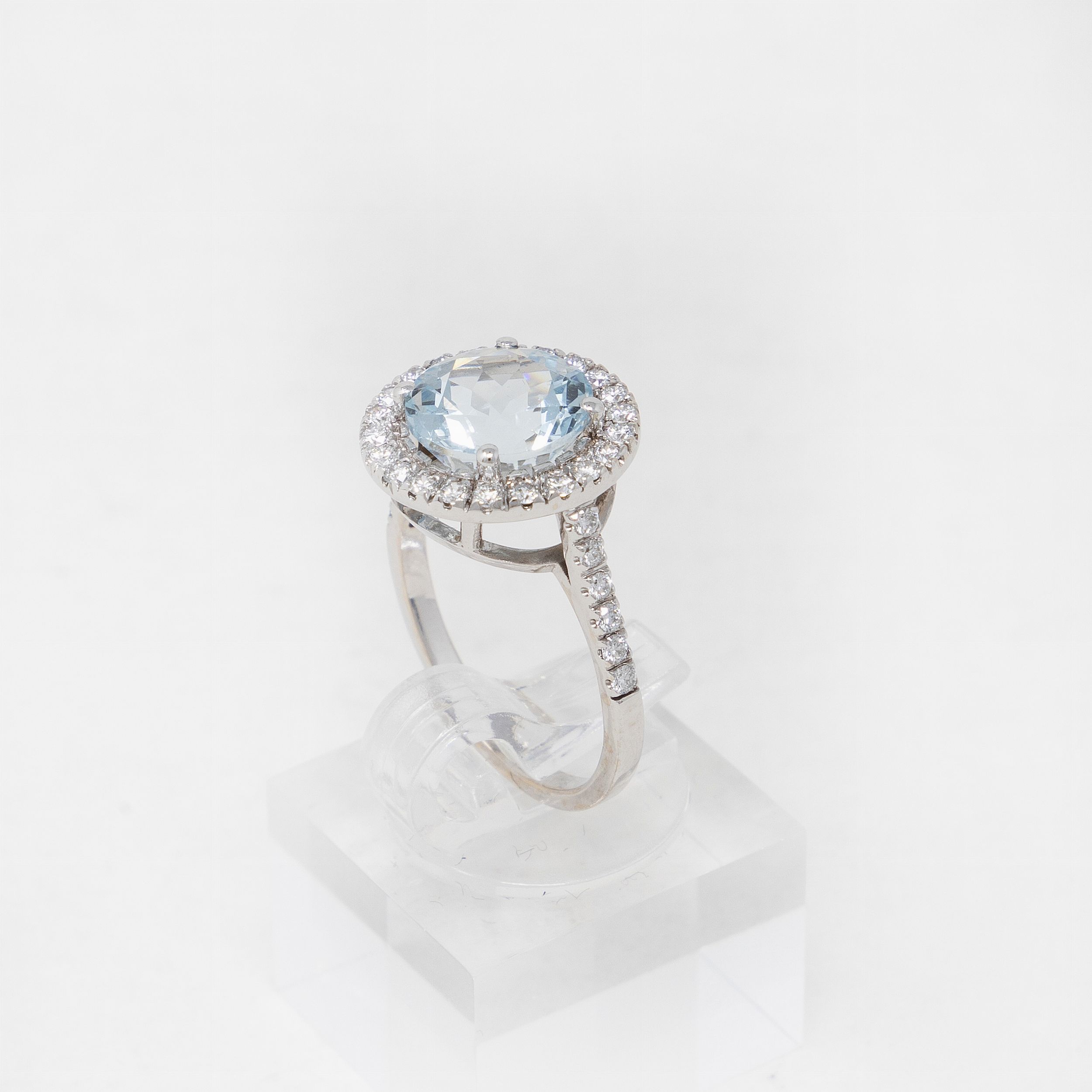 oro 18 kt, acquamarina kt 2,67, diamanti kt 0,48, misura 14, g 3,8.
