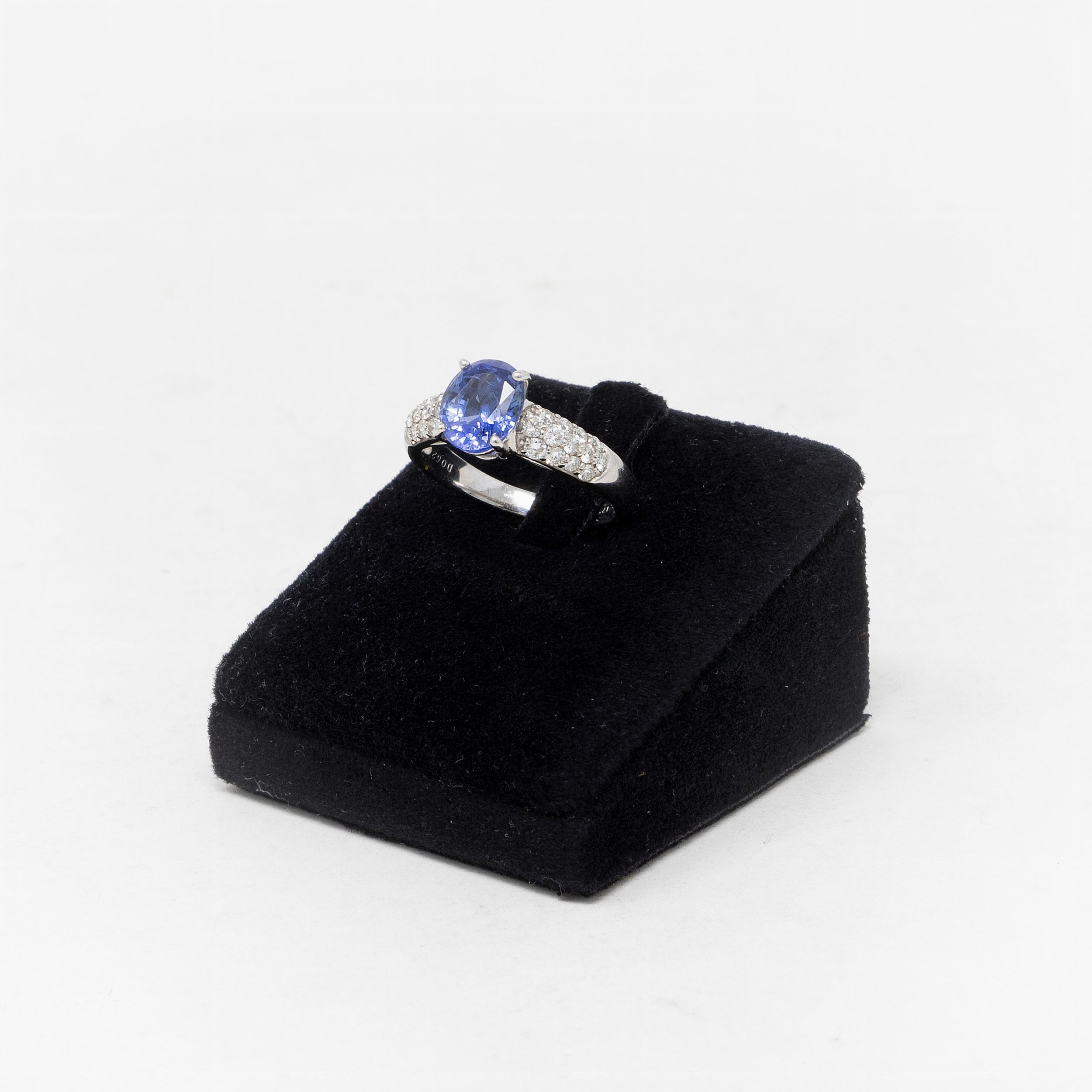 platino 900/1000, zaffiro kt 2,179, diamanti taglio brillante kt 0,52, misura 13, g 5,7.