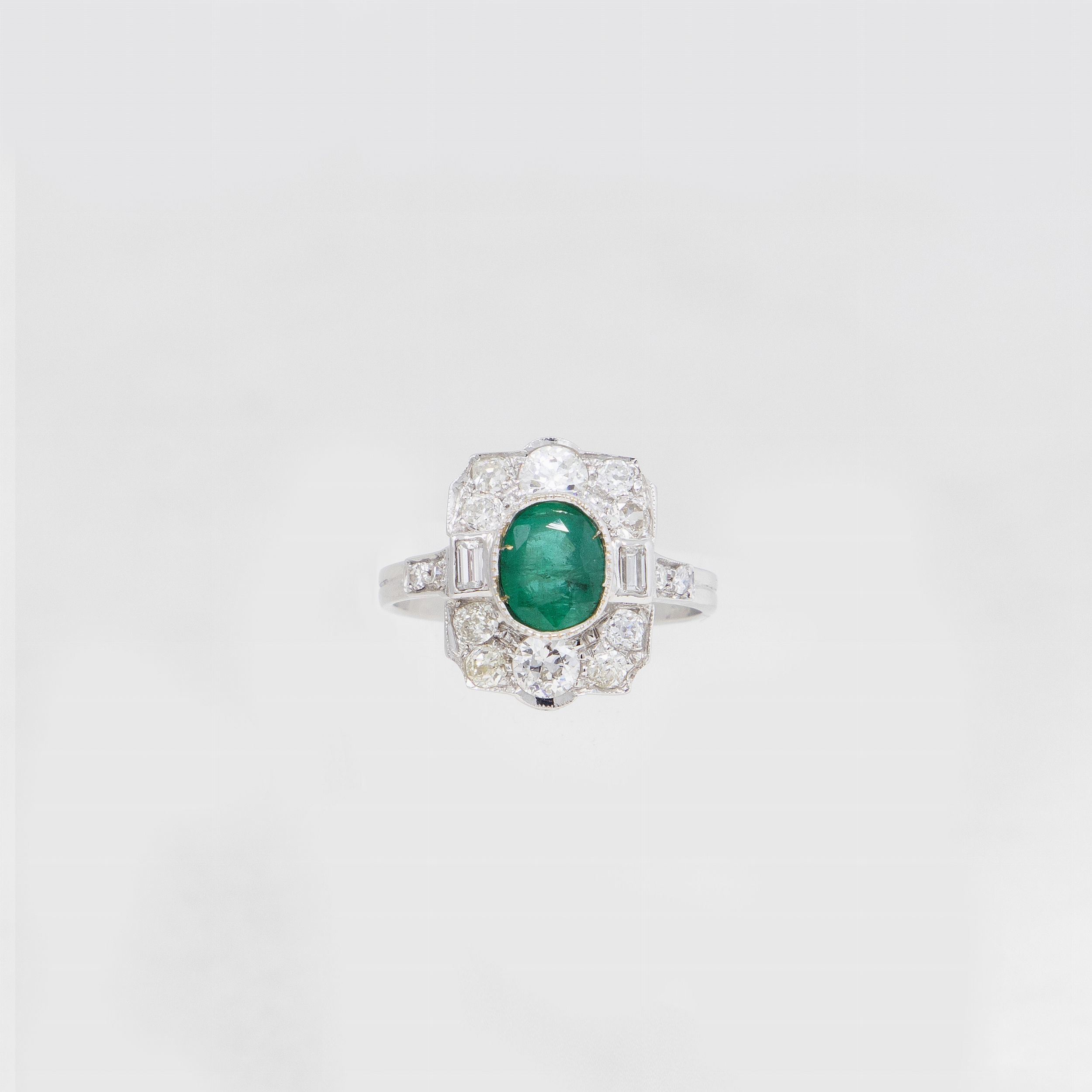 Anello rettangolare in oro bianco con smeraldo e diamanti