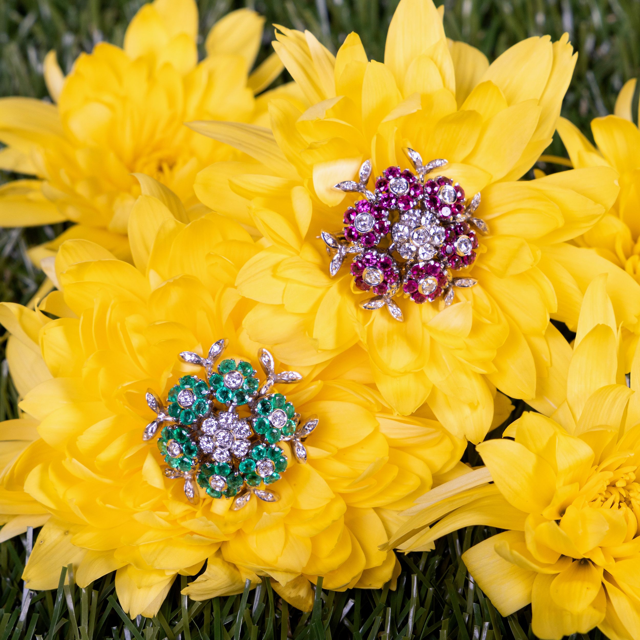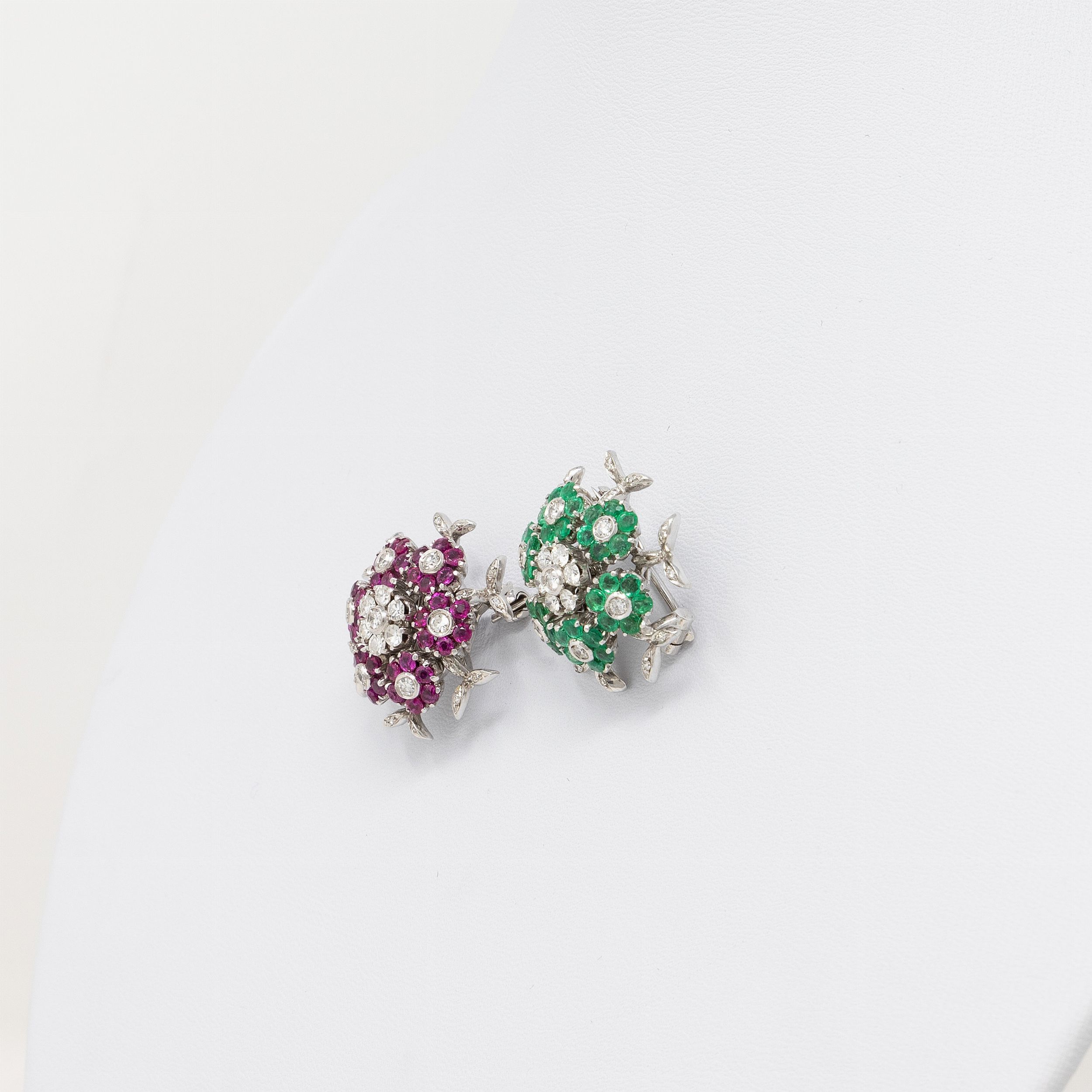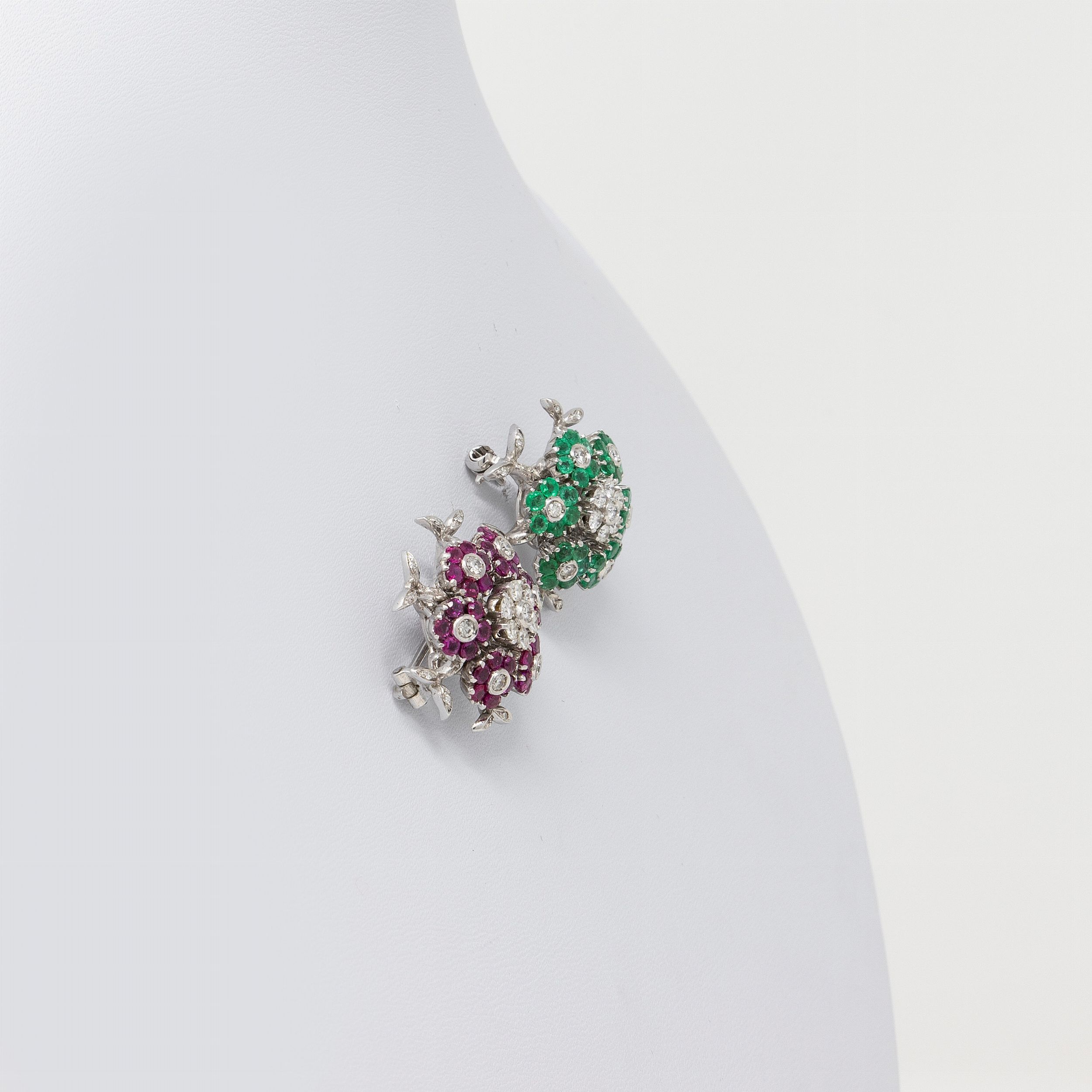 Coppia di spille a corolla in oro bianco con rubini, smeraldi e brillanti