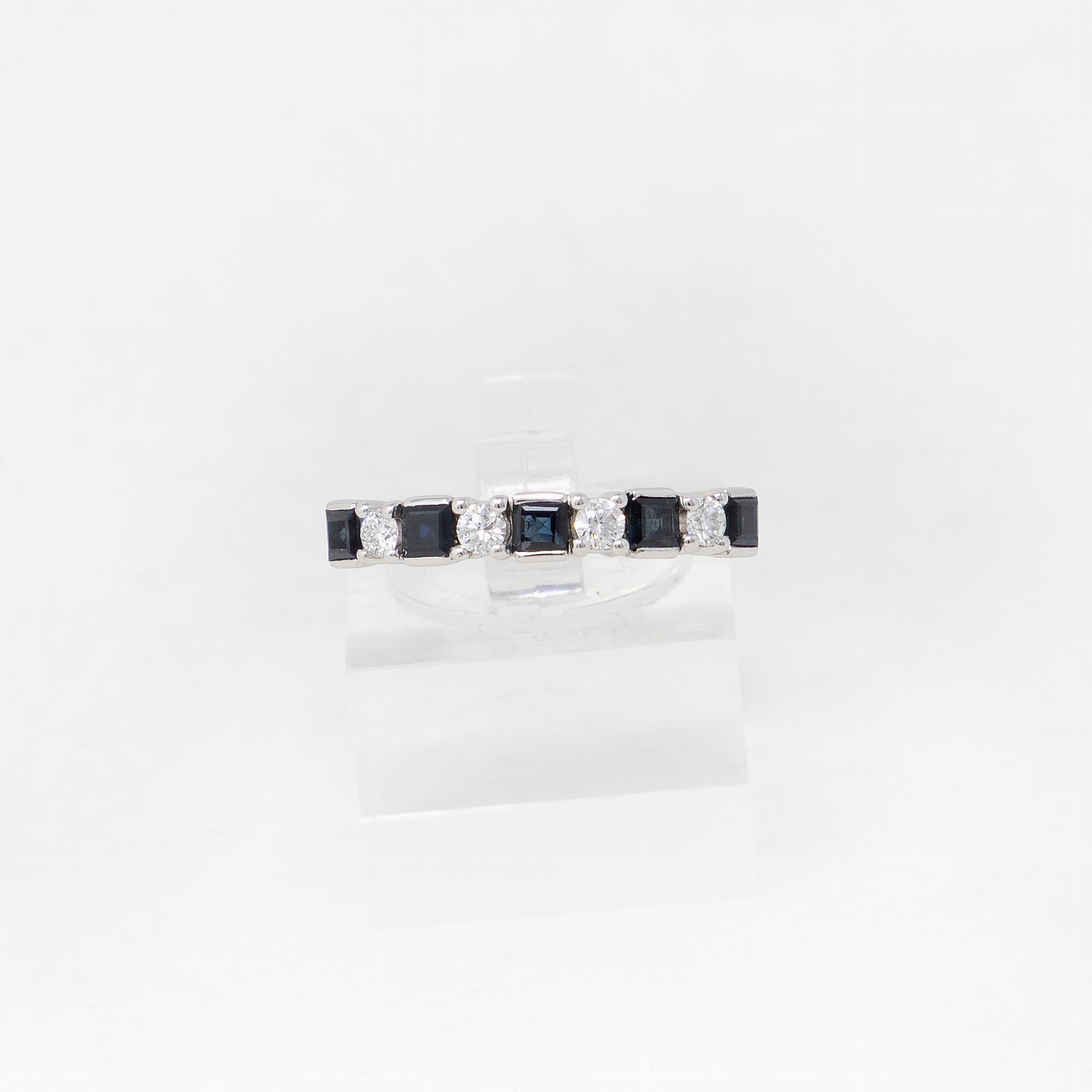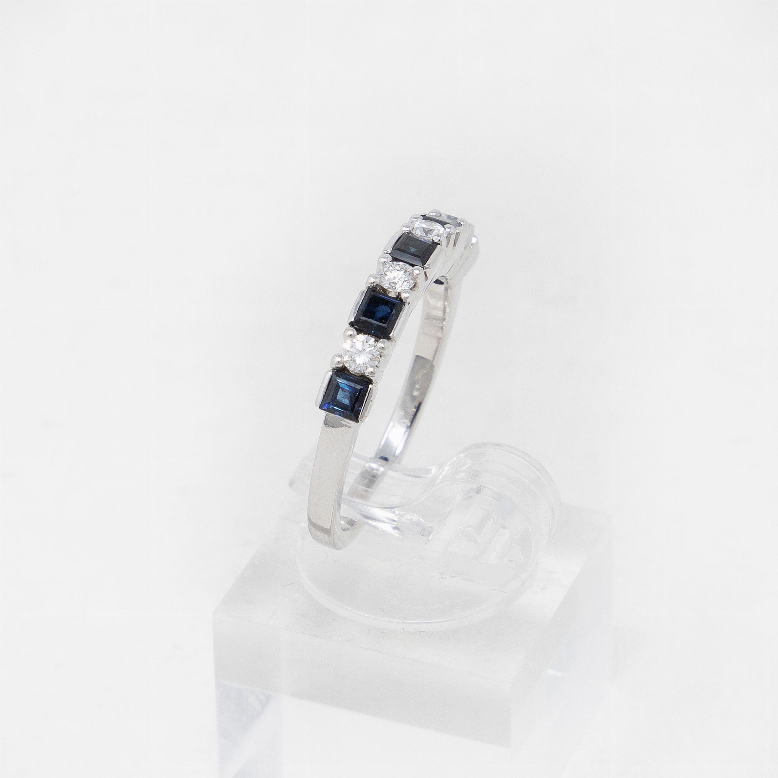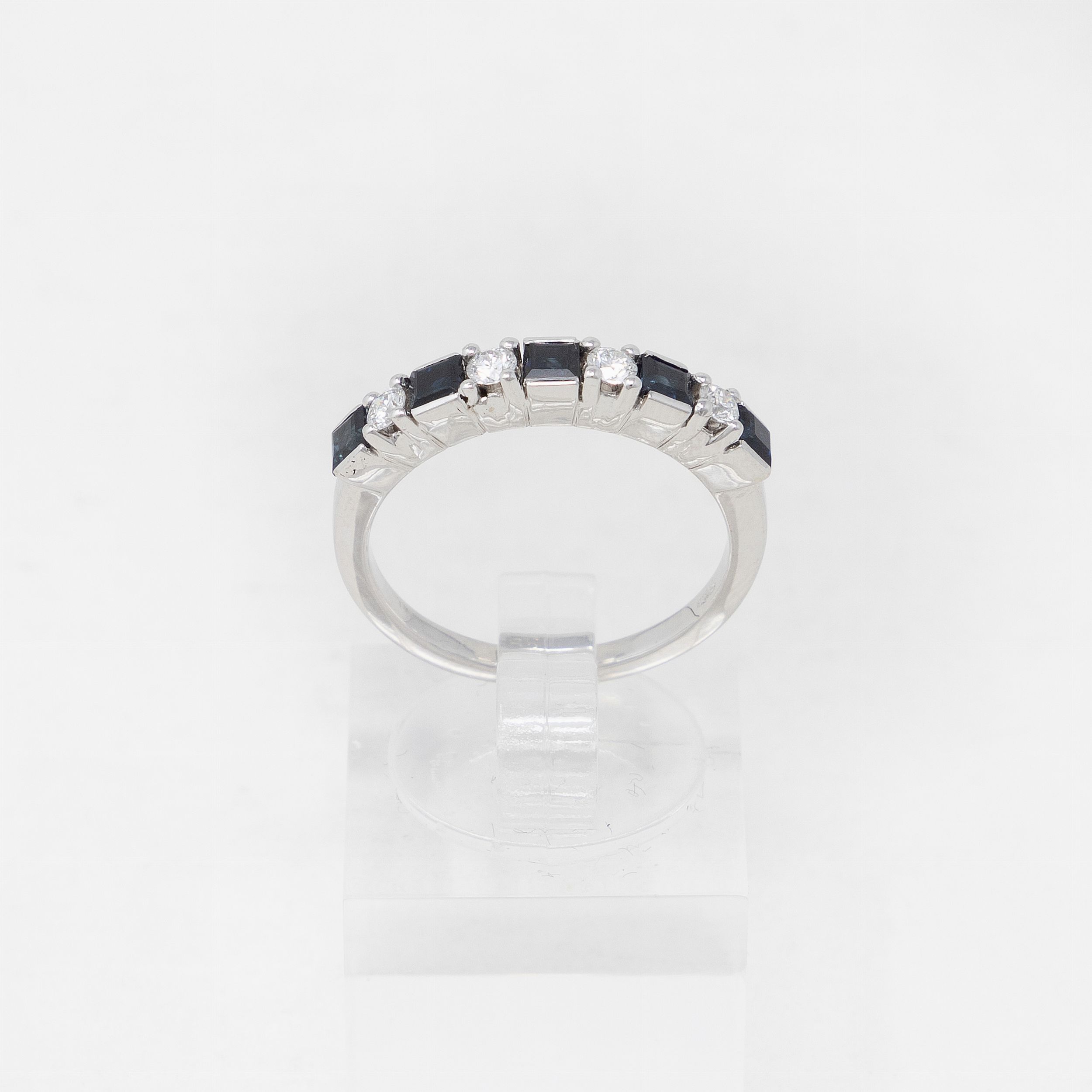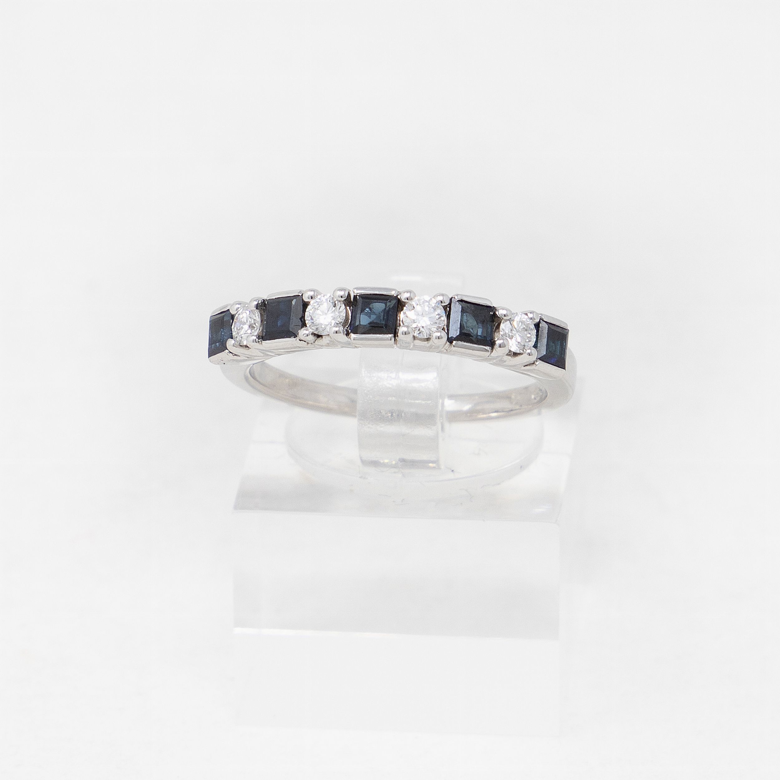 Oro 18 kt, zaffiri taglio quadrato kt 0,69, diamanti kt 0,21, misura 15, g 3,7.