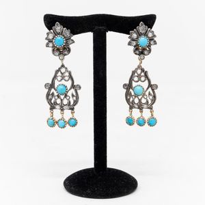 Orecchini pendenti in oro giallo, argento, diamanti e turchesi