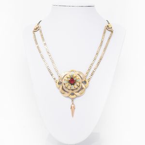 Antica collana in oro giallo con smalto e pietra sintetica rossa