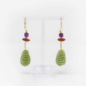 Orecchini pendenti in oro giallo con peridoti, corniola e ametista