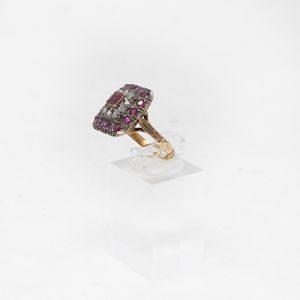 Anello rettangolare in oro giallo, argento, rubini e rose di diamante