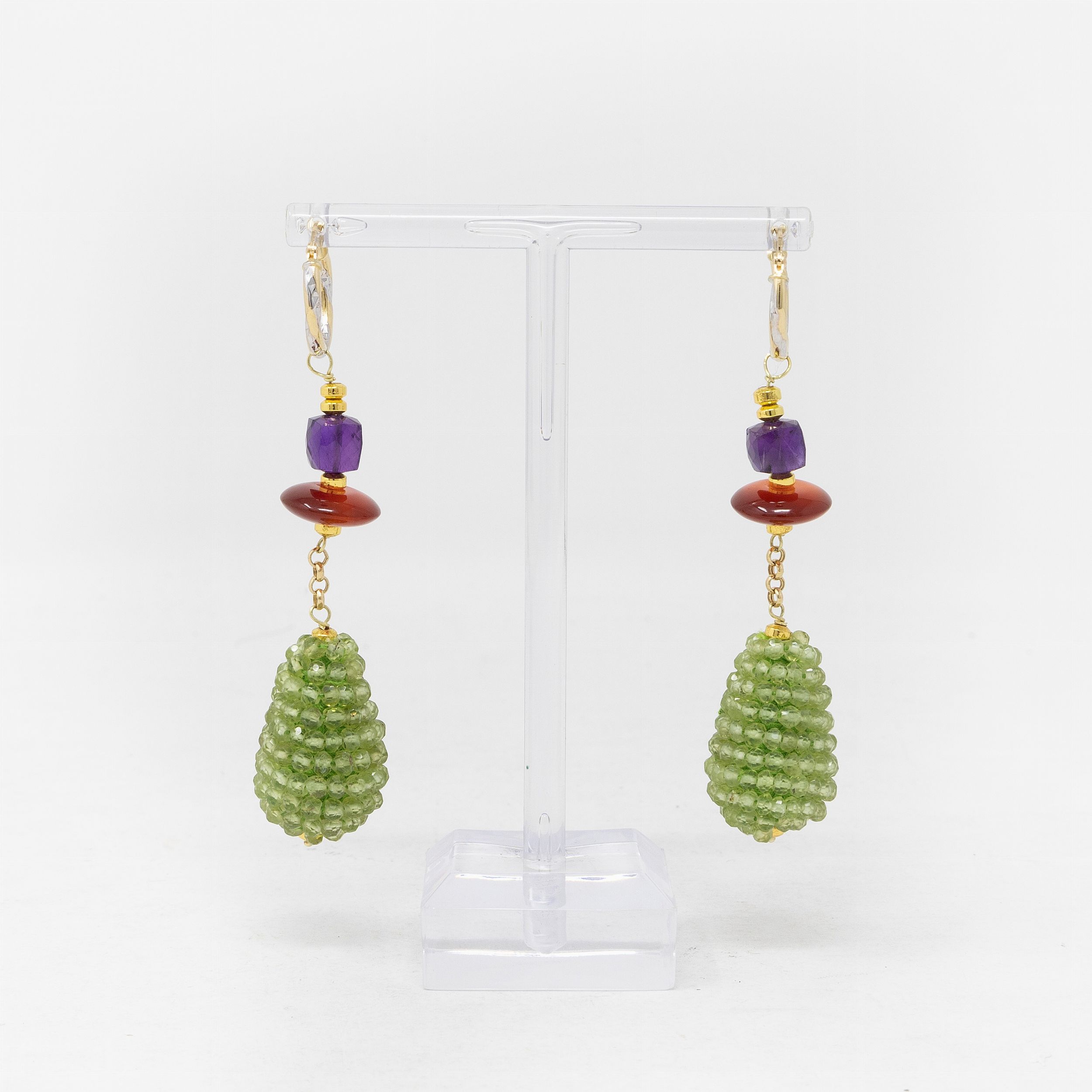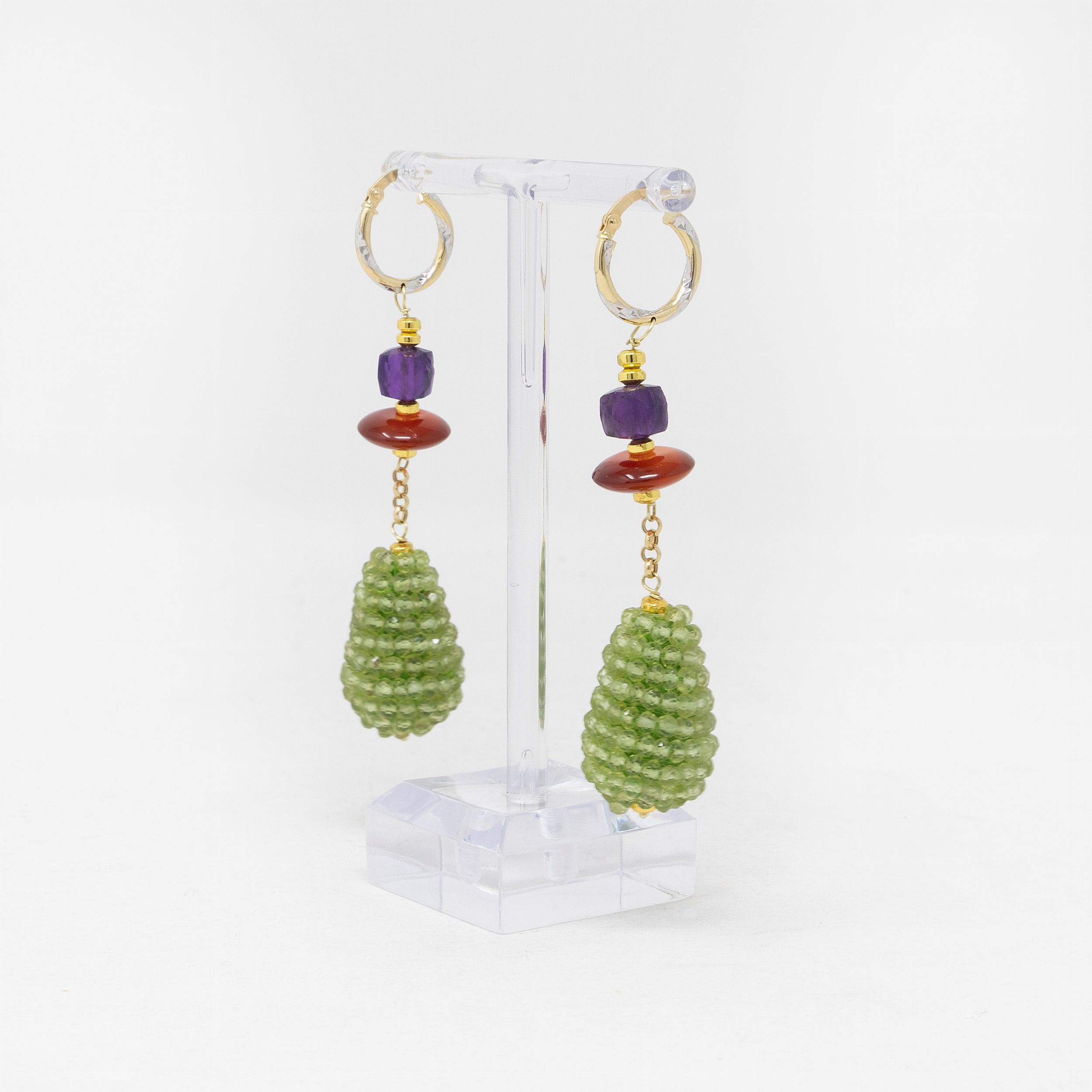 Orecchini pendenti in oro giallo con peridoti, corniola e ametista