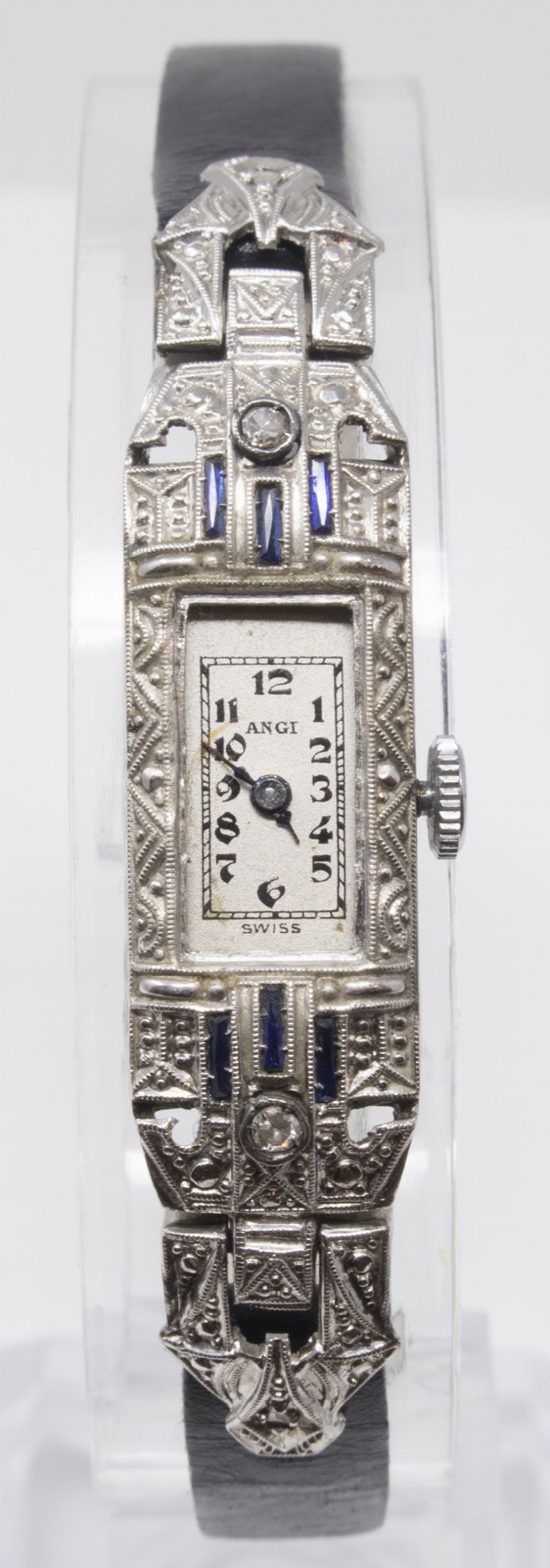 Orologio da polso donna Art Déco in platino con piccoli brillanti e zaffiri