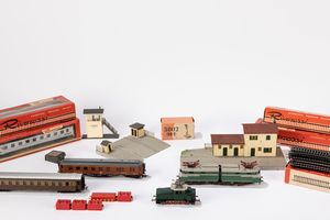 Lotto composto da 2 motrici, 3 vagoni, 1 stazione, 1 passaggio a livello e pezzi vari In plastica e metallo