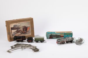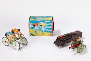 Lotto composto da un treno in latta prodotto in Giappone, 2 ciclisti in plastica prodotto in Italia e un cannone [..]