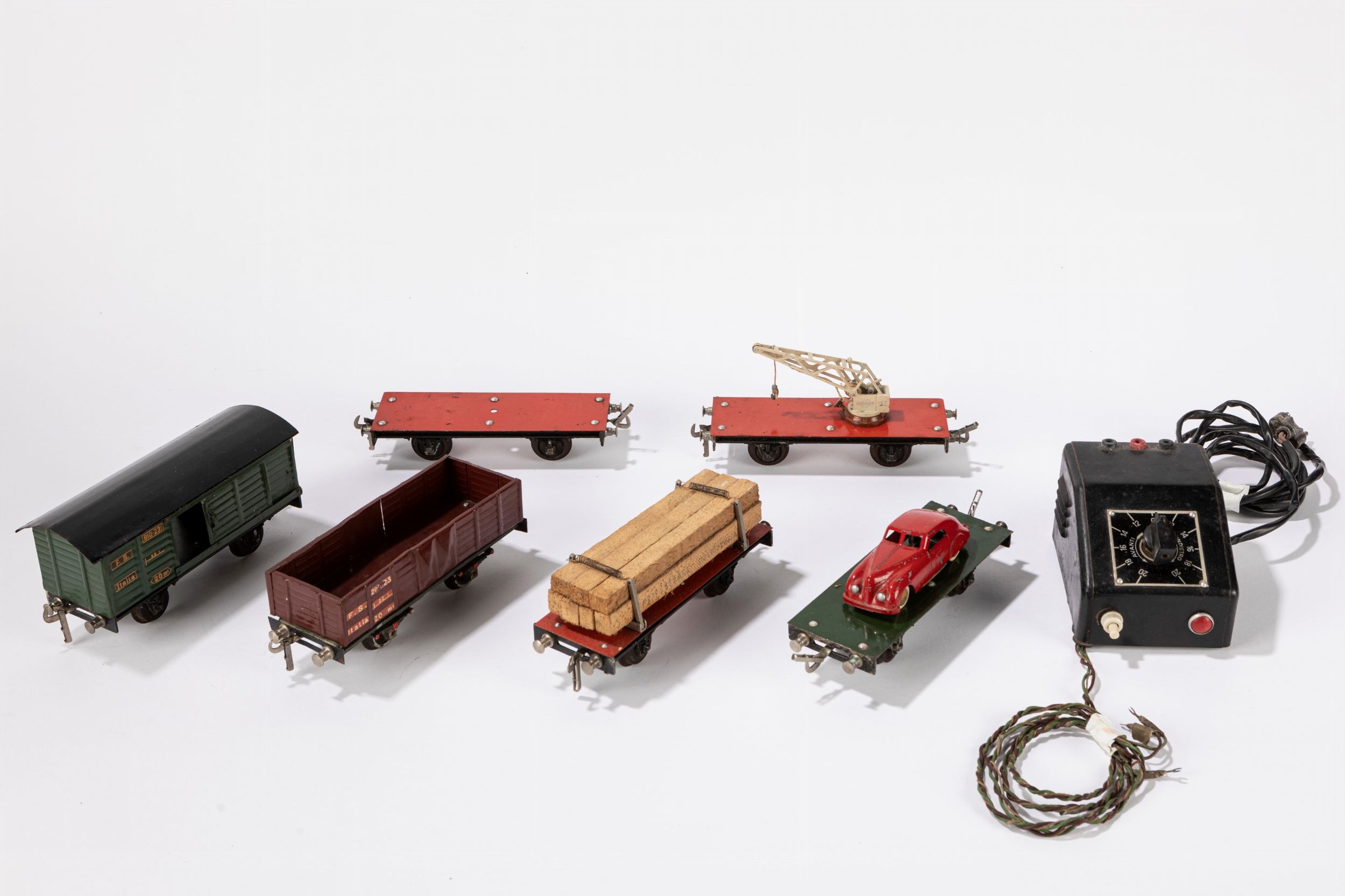 Vagone con auto Mercury, 2 vagoni merci, 1 vadone gru, un vagone porta legni e un vagone generico (incompleto)