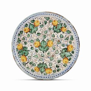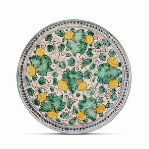 PIATTO, MONTELUPO, 1650 CIRCA in maiolica dipinta in policromia, forma piana leggermente concava con orlo arrotondato [..]